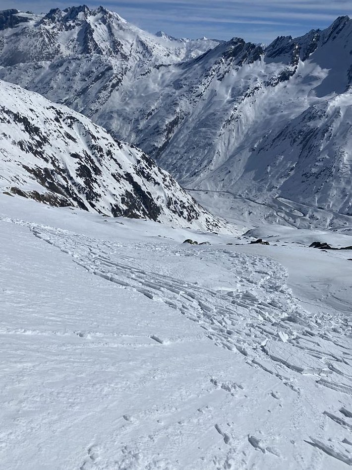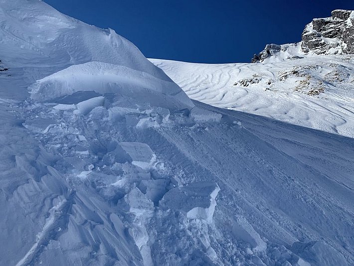 Während dem Schneefall im Nordosten entstanden schon am Freitag, 5. März Triebschneeansammlungen. Besonders an Schattenhängen erwies sich die Altschneeoberfläche der vergangenen Schönwetterperiode als ungünstige Unterlage. Obwohl nur dünn, konnten die Triebschneeansammlungen teils recht flächig ausgelöst werden (Abbildung 4). Mit hoher Auslösebereitschaft, aber relativ wenig Gefahrenstellen und meist kleinen Lawinen wurde die Lawinengefahr in den Hauptniederschlagsgebieten ab Freitag mit Stufe 2 (mässig) eingestuft. Die Gefährdung ging vor allem von der Absturzgefahr aus. Mit den erneuten Schneefällen wurde am Montag, 8. März tagsüber in einem kleinen Gebiet zwischen Reuss und Glarus sogar vor erheblicher Lawinengefahr (Stufe 3) gewarnt.
