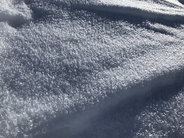 Nach der langen Trockenperiode der zweiten Februarhälfte war die Schneeoberfläche an windgeschützten Schattenhängen kantig aufgebaut und locker. Zudem wurde in dieser Berichtsperiode verschiedentlich Oberflächenreif beobachtet (Abbildungen 6 und 7), und mit den wiederholten Schauern wohl teilweise auch eingeschneit. Bisher waren diese Schwachschichten nahe an der Oberfläche und erst dort ein Problem, wo sie mit Triebschnee überdeckt wurden. Mit den Schneefällen der nächsten Tage wird sich das Problem ausdehnen, weil vielerorts ein Schneebrett (Slab) entsteht, und mit seiner Dicke auch die Lawinengrösse deutlich zunimmt.