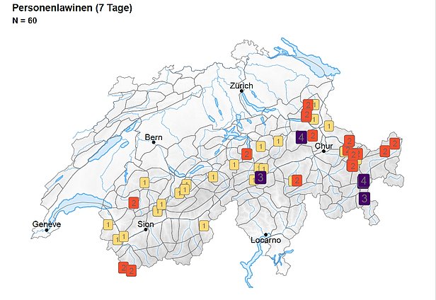 In dieser Wochenberichtsperiode wurden 60 Lawinen durch Personen ausgelöst (vgl. Abb. 13). Die meisten lösten sich im Triebschnee, einige und v.a. solche der Grössen 3 und 4 (gross, sehr gross) im tiefen Altschnee.