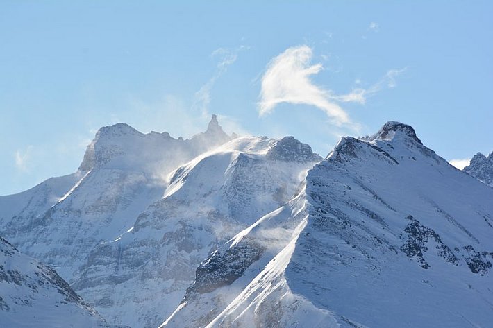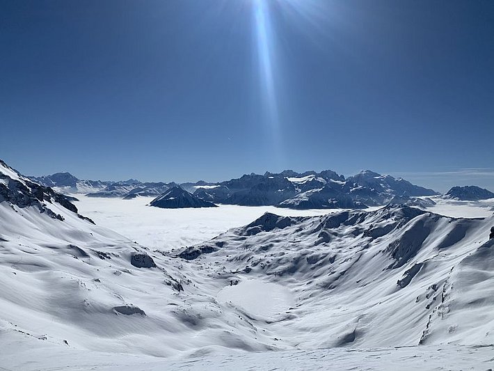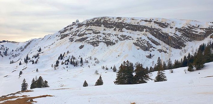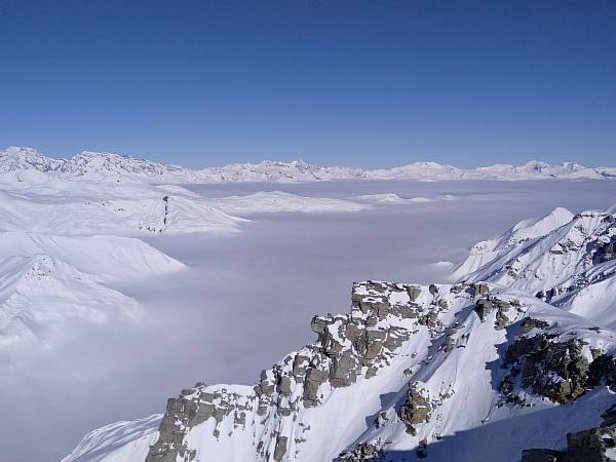 Von Samstag bis Montag war es in den Bergen sonnig und am Wochenende kalt. Am Samstag lag beidseits der Alpen eine Hochnebeldecke mit einer Obergrenze zwischen 1700 und 2200 m (vgl. Abbildung 2). In der Nacht zum Sonntag und am Sonntagvormittag sorgte eine seichte Föhnströmung v.a. in den östlichen Gebieten überraschend für Triebschneebildung in mittleren und hohen Lagen. Am Montag war es am Alpennordhang zum Teil, sonst meist sonnig und wieder wärmer. Abgesehen von der erwähnten, mässigen bis starken Föhnströmung blies der Wind aus Westen und nur in der Höhe zeitweise stark. Im Jura blies zeitweise starke Bise.