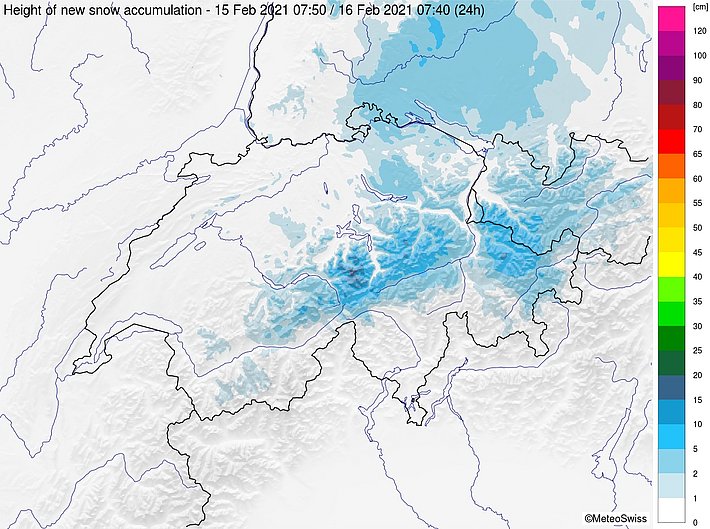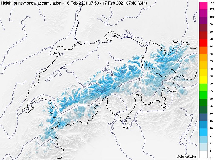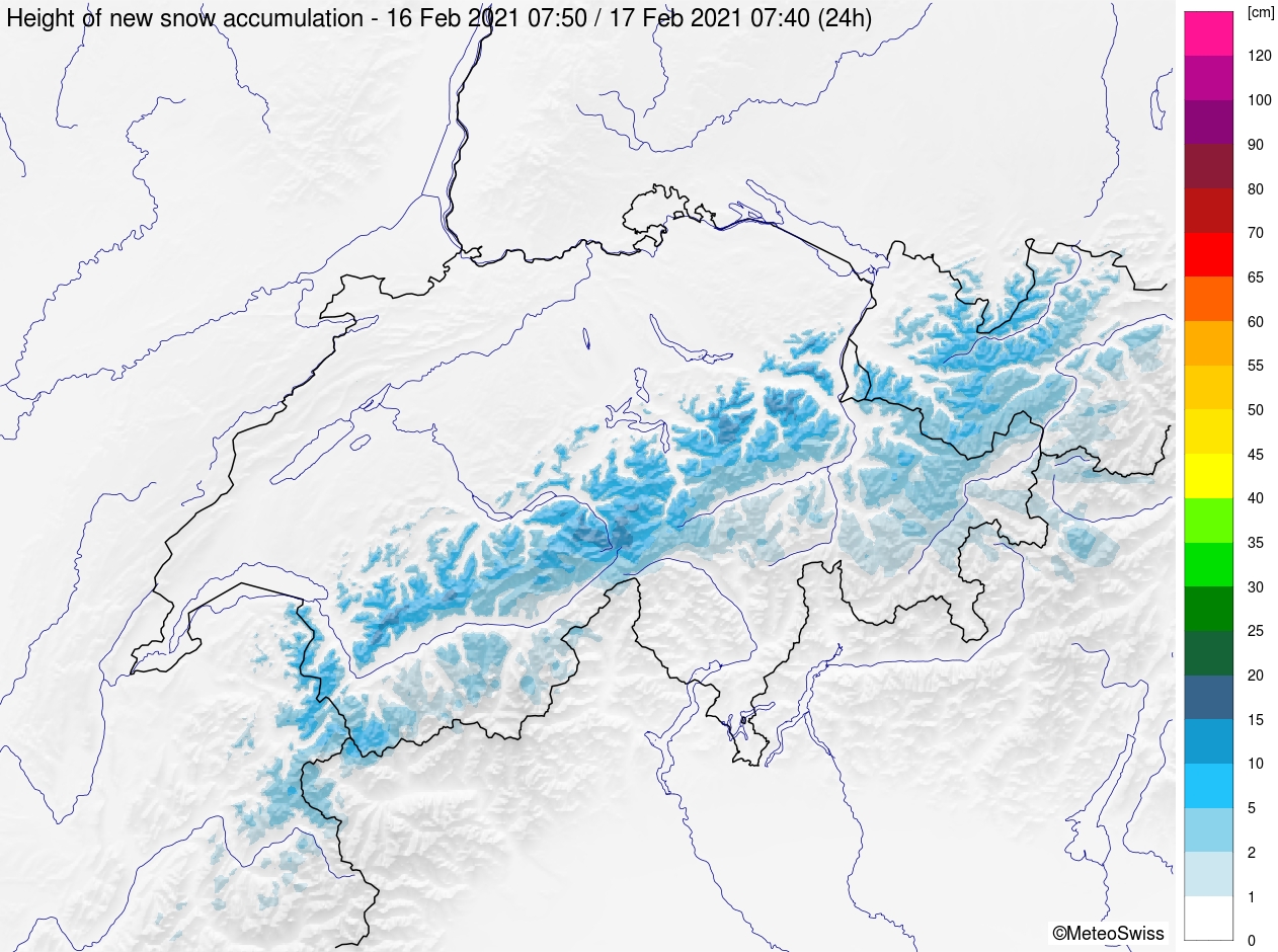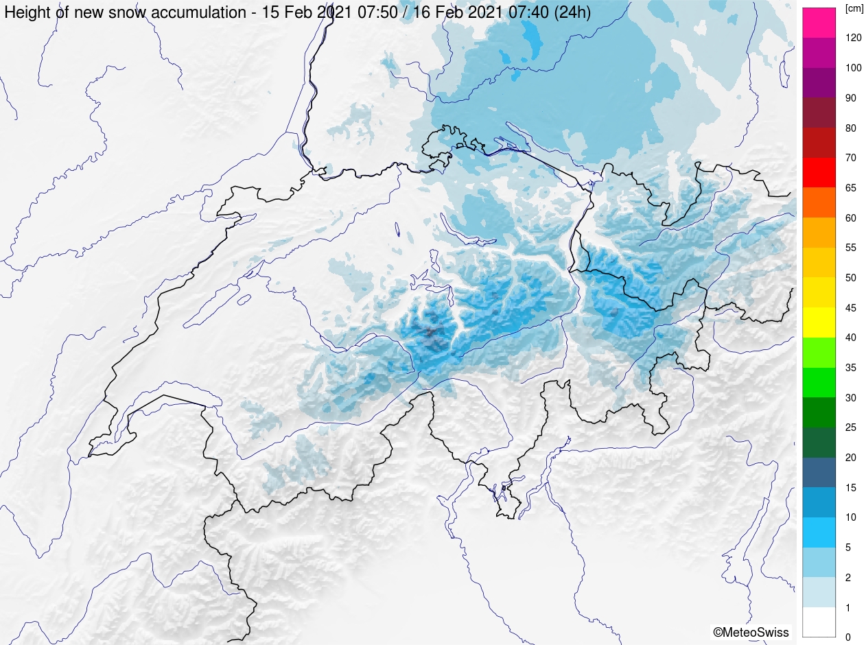 In der Nacht zum Dienstag fiel vor allem in den zentalen und östlichen Gebieten wenig Schnee oberhalb von 1200 bis 1500 m (vgl. Abbildung 3), tagsüber war es im Jura, an den westlichen Voralpen und im Süden meist sonnig, in den anderen Regionen noch länger bewölkt. Kaum Sonne gab es von Nordbünden bis ins Alpsteingebiet. Die Niederschläge waren von mässigem bis starkem Westwind begleitet, im Jura blies starker Südwestwind. Tagsüber flaute der Wind ab.