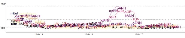 Die Triebschneeansammlungen dieser Berichtsperiode waren in der Regel klein oder mittelgross (vgl. Abb. 9). Sie entstanden meist mit Wind aus westlichen Richtungen und vor allem in der Höhe, wobei vom Freitag, 12.02. bis am Montag, 15.02. Altschnee, am Dienstag, 16.02. und Mittwoch, 17.02. Neuschnee verfrachtet wurde.
