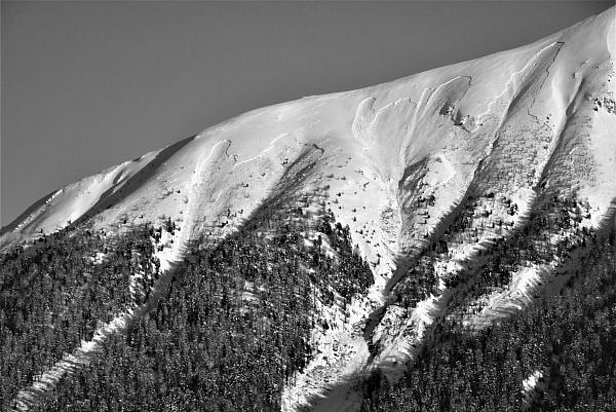 Am Freitag, 12.02. wurden unter anderen am Piz Murtiröl (Zuoz, GR, 2660 m) (vgl. Abbildung 5 und 6) zwei sehr grosse Schneebrettlawine im Altschnee fernausgelöst, nachdem bereits am Vortag der Bereich befahren wurde. Diese Lawinen reihten sich in die praktisch täglichen Meldungen zu Altschneebrüchen und zeigten auf, dass das Potential für grosse und sehr grosse Lawinen immer noch vorhanden war.