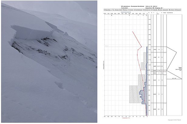 Video: Lawinenauslösung im oberen Leidbachtal (Nordwesthang, 2800 m, Davos, GR) am 23. März: Die Lawine brach am Übergang zum Altschnee an. Ein Schneeprofil, welches am Folgetag am Anriss erstellt wurde, zeigte aufbauend umgewandelte Schichten an der Altschneeoberfläche.