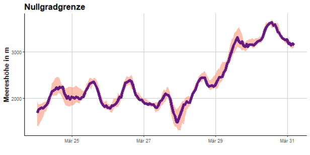 Sonne pur und milde Temperaturen wurden in dieser Wochenberichtsperiode nur von einer kurzen Störung am Samstag, 27. März unterbrochen. An den übrigen Tagen war es in den Bergen sonnig und mild. Zu Beginn der Periode lag die Nullgradgrenze (Abb. 1) um 2000 m. Am Sonntag, 28. März stieg sie an und lag seit Montag, 29. März oberhalb von 3000 m. Der Wind blies meist schwach bis mässig aus westlichen Richtungen.