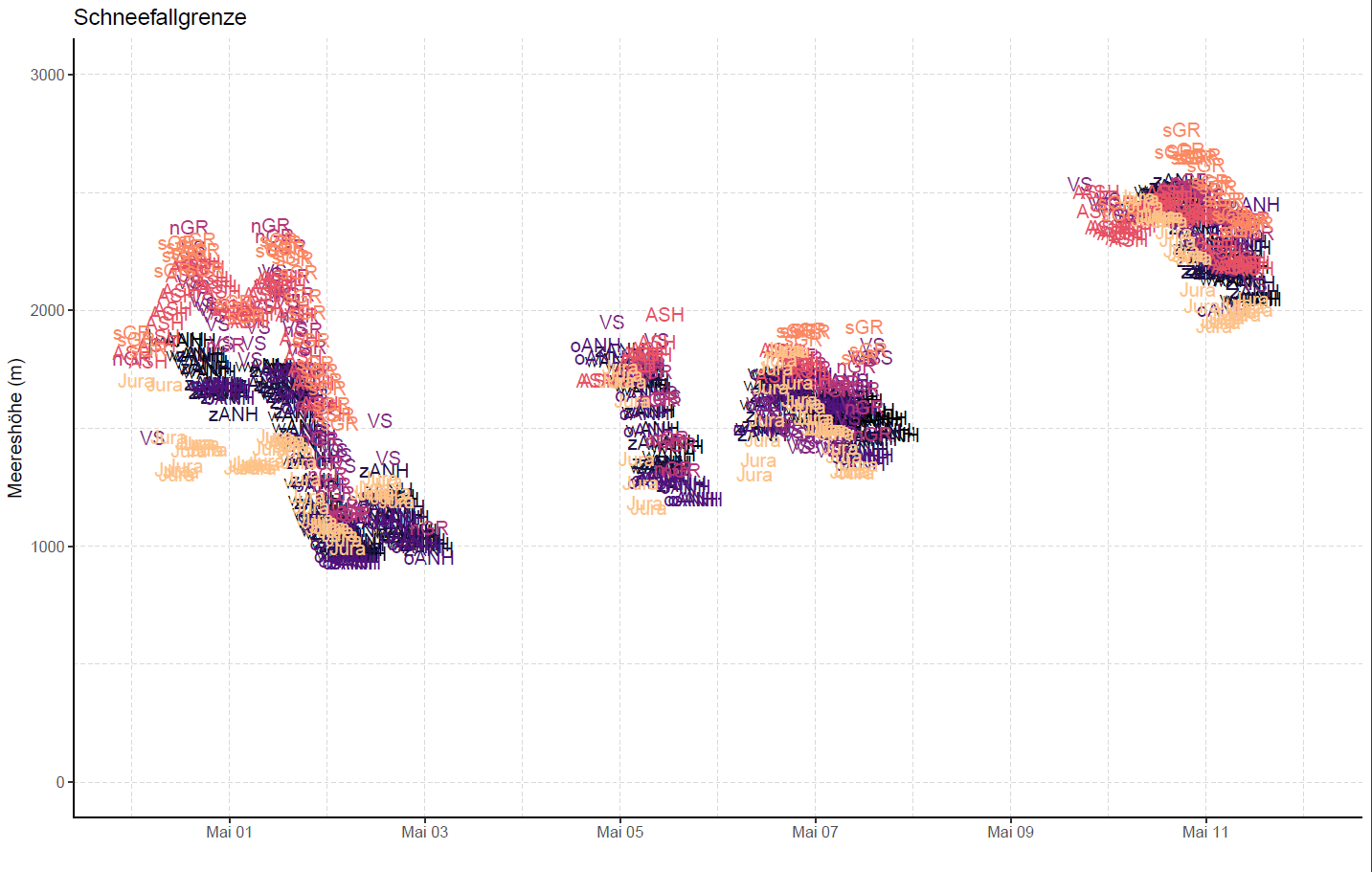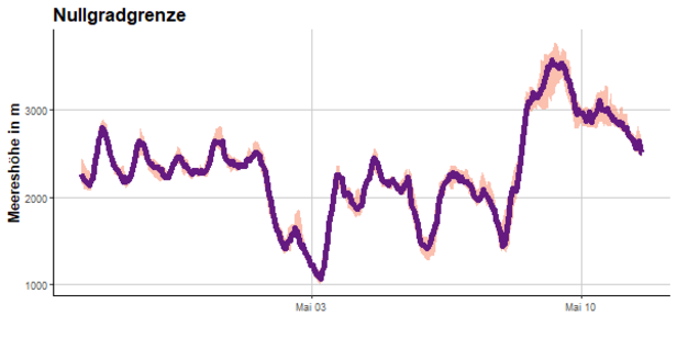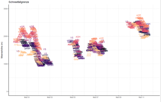 In dieser Berichtsperiode war das Wetter wechselhaft und es fiel häufig Niederschlag. In Abb. 1 ist die Schneefallgrenze über die gesamte Periode dargestellt. Es wird nur ein Punkt dargestellt, wenn in der Region zum gegebenen Zeitpunkt Niederschlag gefallen ist. Dabei wird ersichtlich, dass fast immer irgendwo Niederschlag fiel. Ausnahmen waren zwei längere trockene Phasen von Mittwoch, 4. Mai bis Donnerstagmittag, 5. Mai und am Wochenende vom 8. bis 9. Mai.