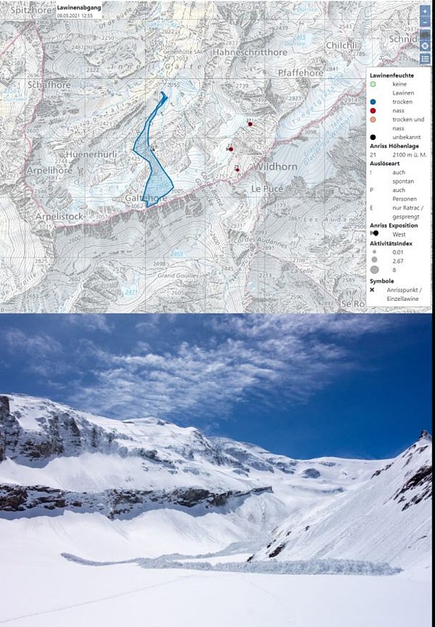 Am Samstag, 8. Mai und Sonntag, 9. Mai herrschte eine rege Tourenaktivität. So bekam der Lawinenwarndienst auch wieder mehr Meldungen. Es wurden einige spontane Lawinen beobachtet und auch Lawinen von Personen ausgelöst. Lawinen rissen sowohl trocken als auch nass an. Die Brüche breiteten sich erneut oft flächig aus. Meistens gingen die Neuschneeschichten der vergangenen Tage ab. Zum Teil wurden aber auch tiefere Schichten mitgerissen. Ein besonders bemerkenswertes Beispiel ereignete sich am Gältehore (3062, Savièse, VS/Lauenen, BE). Knapp unter dem Gipfel löste ein Tourengeher eine sehr grosse Lawine aus (Abb. 9) und wurde über rund 1000 Höhenmeter und fast 2 km mitgerissen. Die Lawine stiess bis weit in das flache Rottal vor (Abb. 10).
