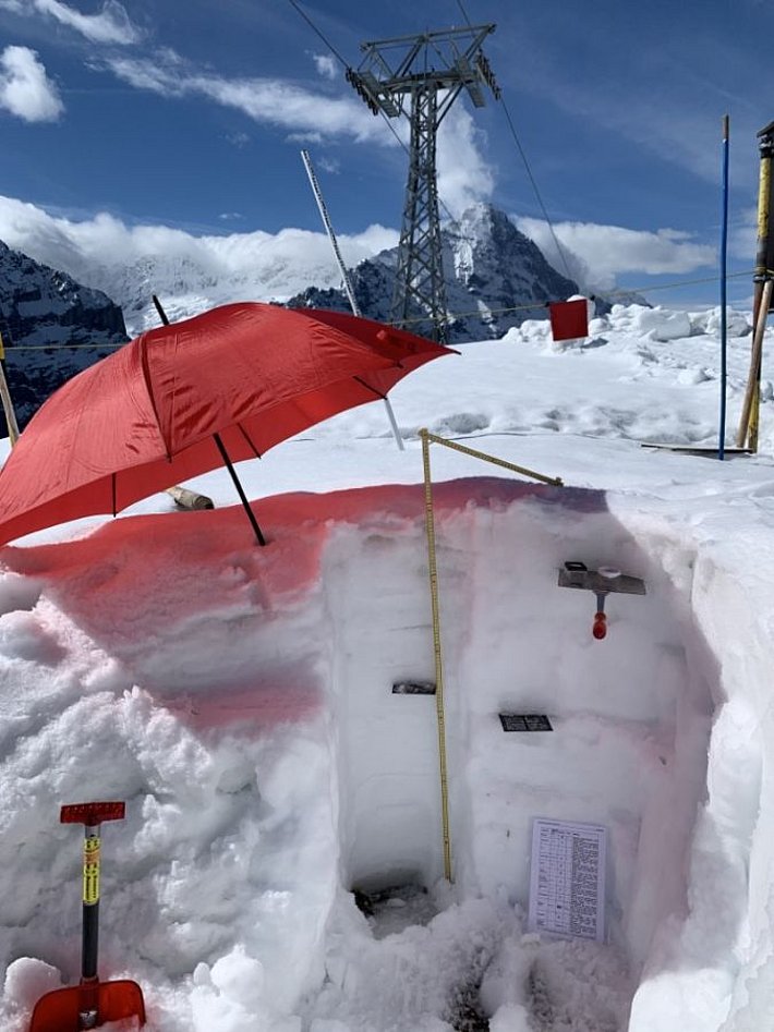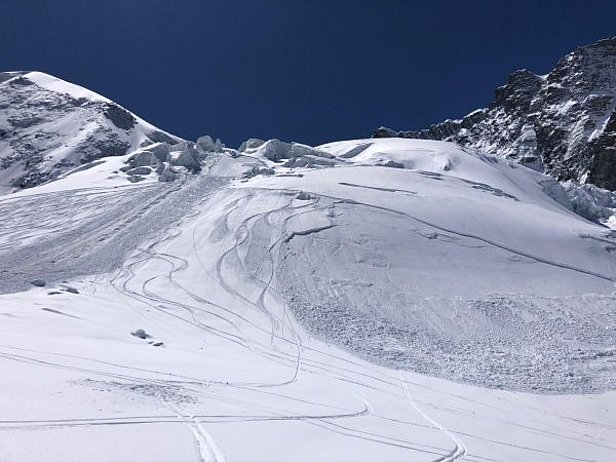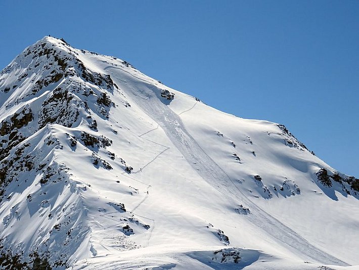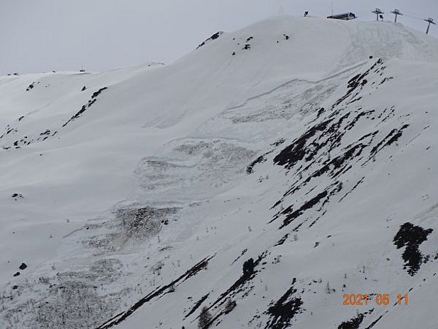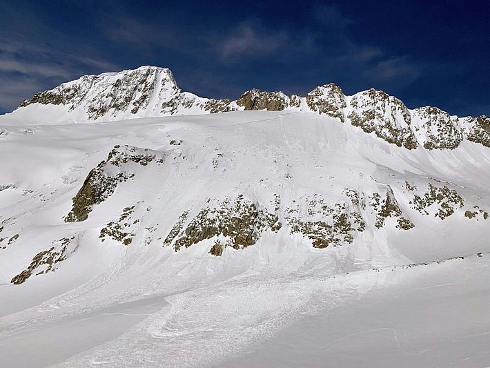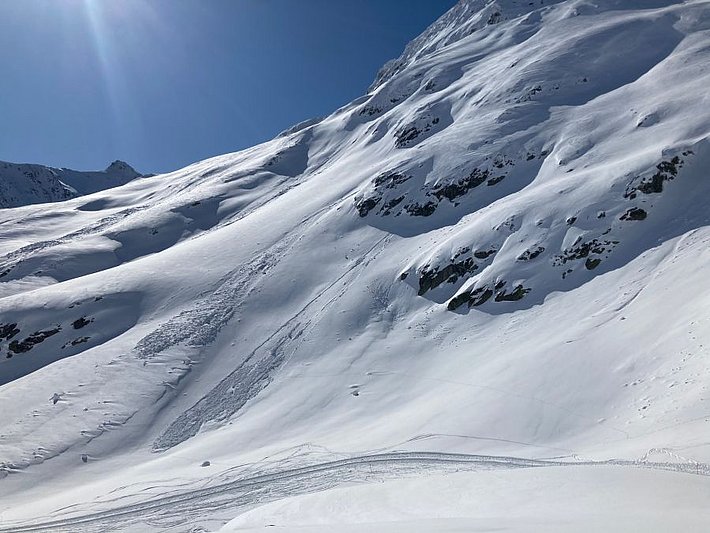Am sonnigen Montag, 3. Mai waren im Gegensatz zum Wochenende viele Tourengeher unterwegs und es wurden zahlreiche Lawinen gemeldet. Es gingen weiterhin spontane feuchte Lawinen aus dem Neuschnee ab. Es wurden zum Teil auch Schneebrettlawinen ausgelöst (Abb. 7). Die Brüche breiteten sich zum Teil recht flächig aus. Vermutlich hatte sich am Übergang vom feuchten Altschnee zum Neuschnee eine Schwachschicht gebildet.