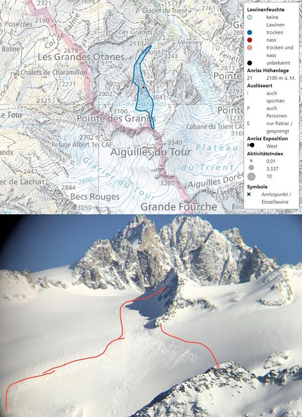 Mit dem vielen Neuschnee gingen ganz im Westen und am nördlichen Alpenkamm am Freitag, 7. Mai einige grosse bis sehr grosse trockene Lawinen ab. Ganz im Westen wurde vor grosser Lawinengefahr gewarnt. Es wurde unter anderen eine sehr grosse Lawine im Trientgebiet (Abb. 8) beobachtet. Da die allermeisten Skigebiete nicht mehr geöffnet sind, werden bei schlechtem Wetter nur sehr wenige Lawinenbeobachtungen gemacht. Es ist also zu vermuten, dass deutlich mehr Lawinen in dieser Periode abgingen als tatsächlich gemeldet wurden.