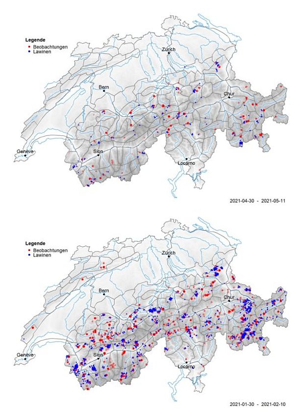 Mit dem wechselhaften Wetter blieb die Lawinensituation für die Jahreszeit dynamisch und winterlich. An allen Tagen wurde gebietsweise, teilweise sogar verbreitet vor erheblicher Lawinengefahr (Stufe 3) gewarnt. Für den Freitag, 07. Mai wurde ganz im Westen, für den Dienstag, 11. Mai im Süden aufgrund der grossen Neuschnee- bzw. Regenmengen sogar grosse Lawinengefahr (Stufe 4) prognostiziert.