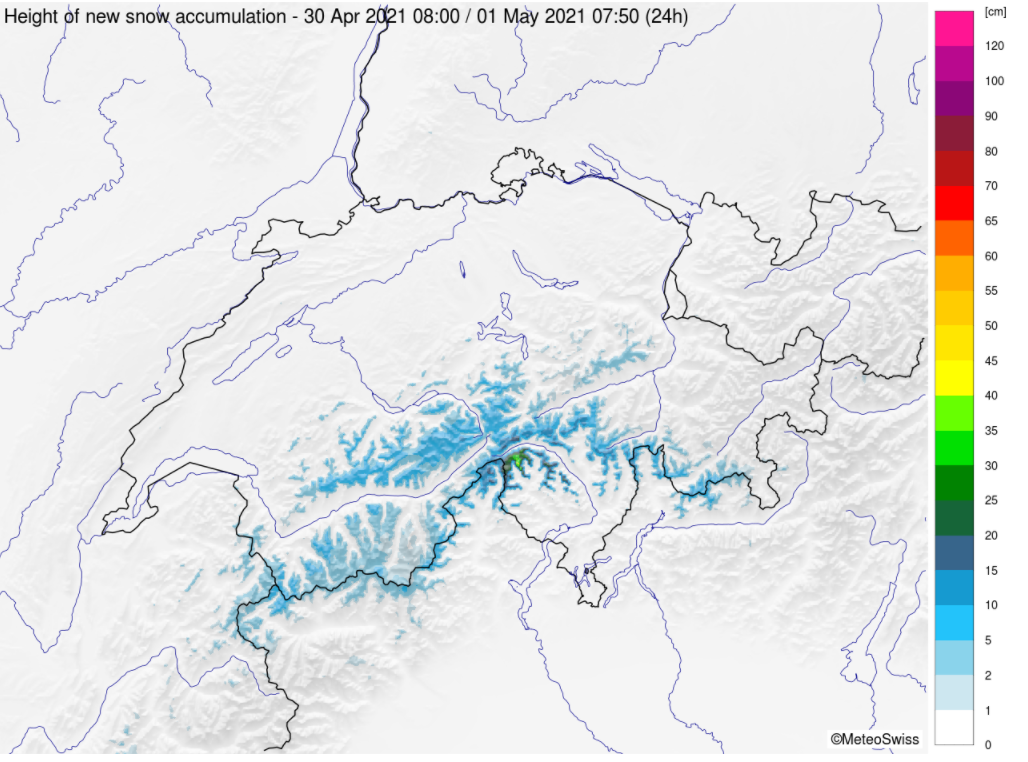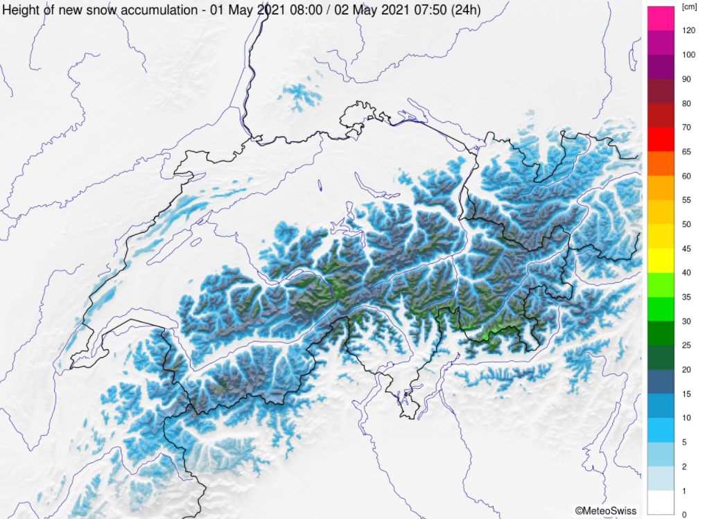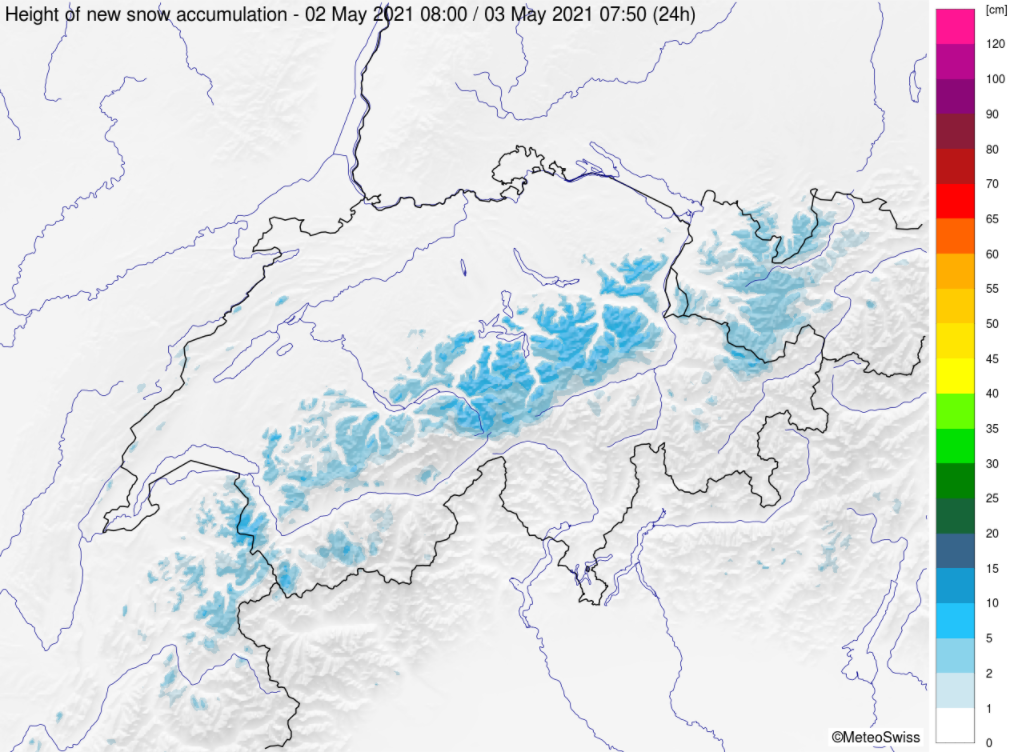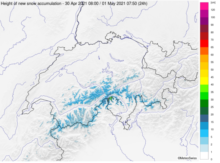 Mit Südwind fiel von Freitag, 30. April bis in die Nacht auf Sonntag, 2. Mai vor allem im Süden oberhalb von rund 2000 bis 2400 m Schnee. Im Norden gab es neben sonnigen Abschnitten auch immer wieder Schauer, aber grosse Neuschneemengen wurden vor allem am zentralen Alpensüdhang und am Alpenhaupkamm, vom Rheinwaldhorn bis in die Bernina registriert. In der Nacht auf Sonntag, 2. Mai zog aus Nordwesten eine Kaltfront über die Schweiz. Damit drehte der Wind auf Nord, die Schneefallgrenze sank markant ab und der Niederschlag verlagerte sich gegen Norden.