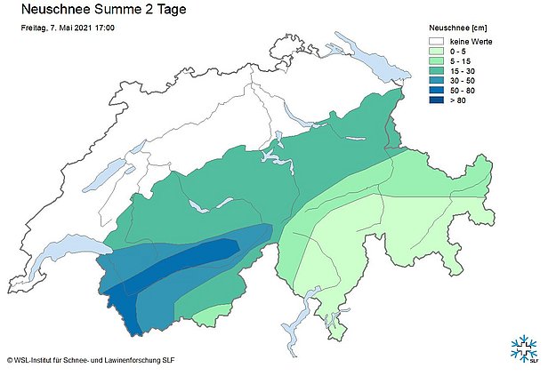 Insgesamt fielen von Sonntagabend bis Dienstagmittag am Alpenhauptkamm vom Allalinhorn bis in die Bernina und südlich davon verbreitet 50 bis 80 cm, lokal bis 120 cm Schnee. Die grössten Niederschlagsmengen fielen ab Montagabend.