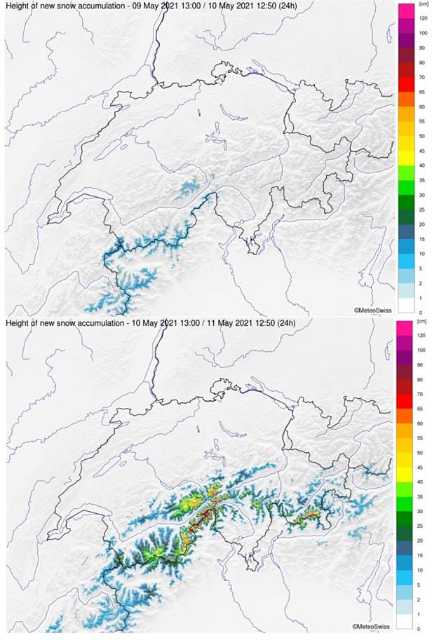 Für Dienstag, 11. Mai wurde am Alpenhauptkamm und südlich davon teils vor grosser Lawinengefahr gewarnt. Im Hochgebirge herrschte aufgrund vom vielen Neuschnee Gefahr von trockenen Lawinen, darunter waren mit dem Regen nasse Lawinen zu erwarten.