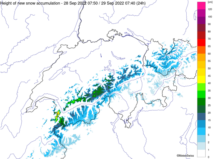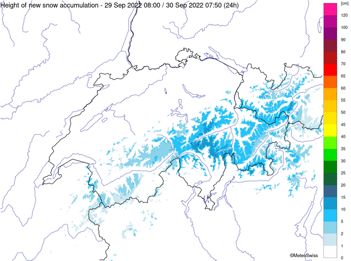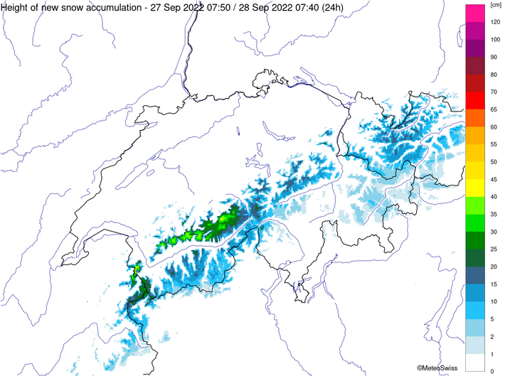 Nach ein paar sonnigen Tagen kam in der Höhe der Schnee zurück: Von Dienstag bis Freitag, 27. bis 30.09., fiel im westlichsten Unterwallis und am Alpennordhang anhaltend und zum Teil ergiebig Niederschlag. Die Schneefallgrenze pendelte dabei zwischen 1600 und 2400 m (Abb. 3.1).