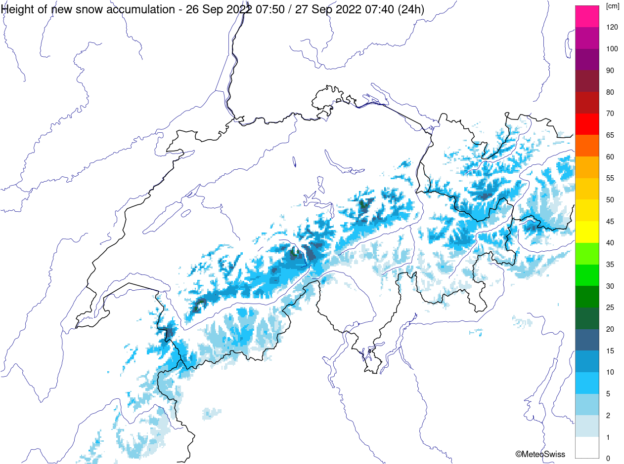 Nach ein paar sonnigen Tagen kam in der Höhe der Schnee zurück: Von Dienstag bis Freitag, 27. bis 30.09., fiel im westlichsten Unterwallis und am Alpennordhang anhaltend und zum Teil ergiebig Niederschlag. Die Schneefallgrenze pendelte dabei zwischen 1600 und 2400 m (Abb. 3.1).