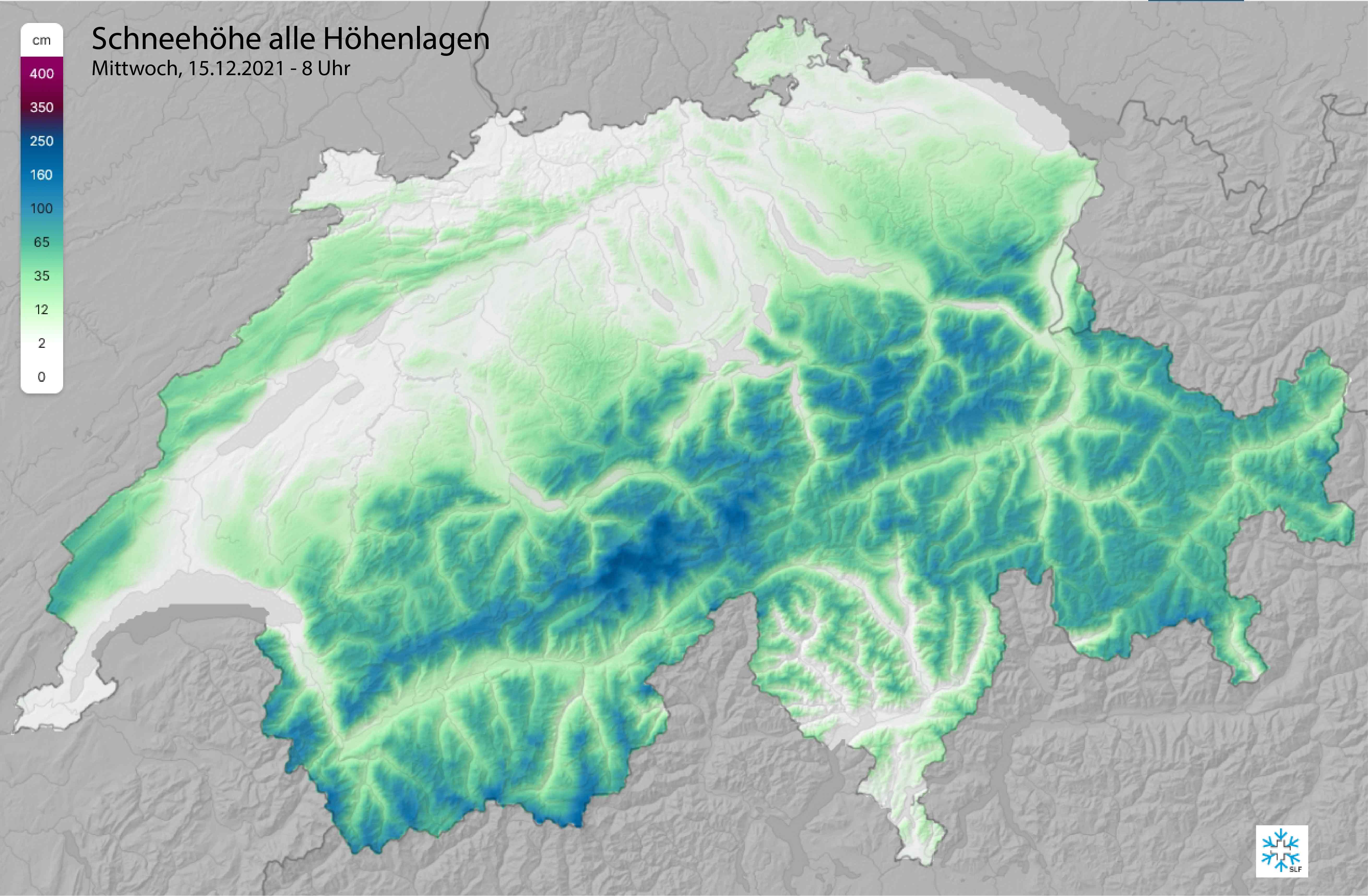 Am Mittwoch, 15.12. waren die Schweizer Alpen vor allem im Norden und auch der Jura bis in tiefe Lagen gut eingeschneit (vgl. Abb. 14 und Abb. 15).