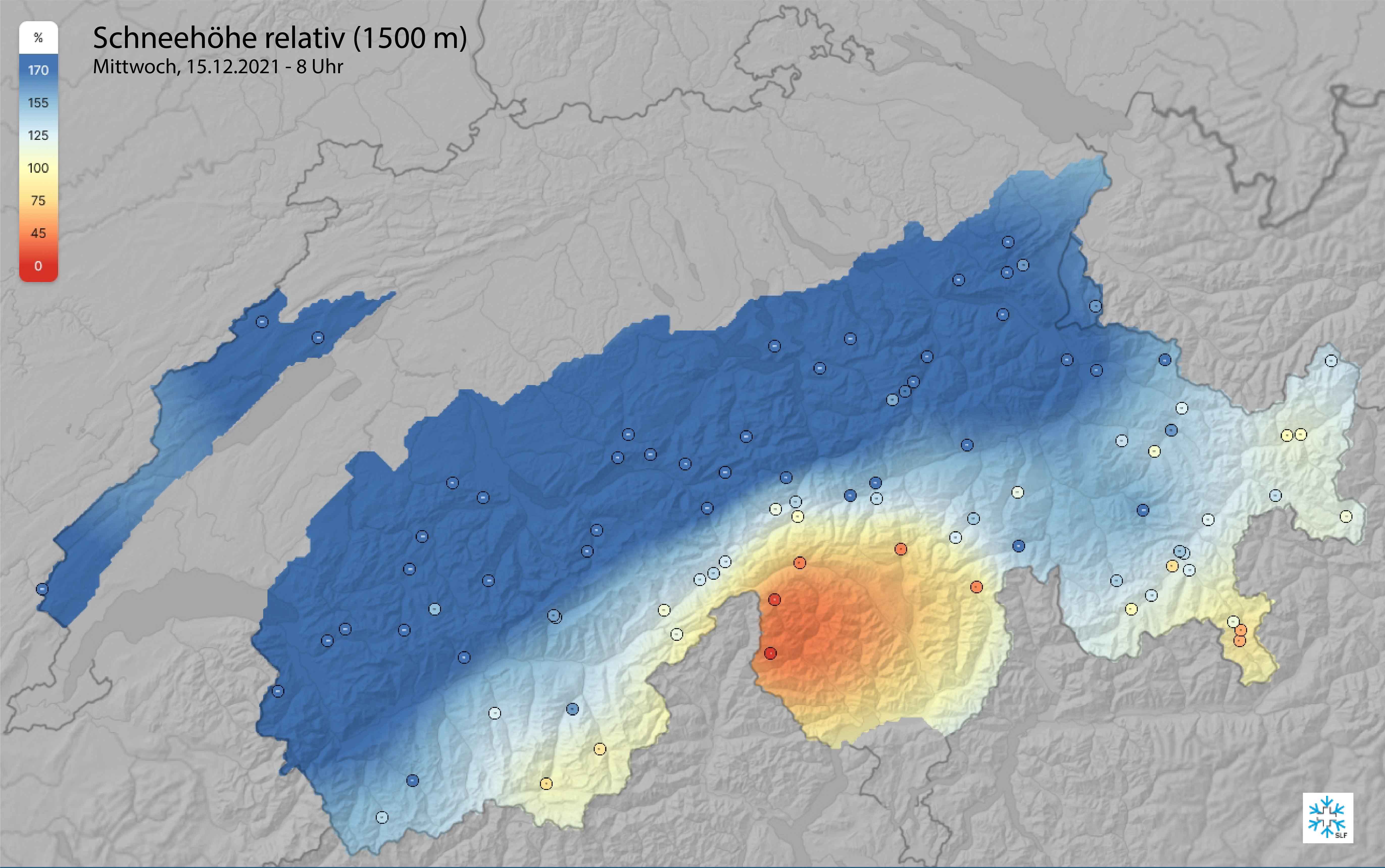 Die wiederholten Schneefälle seit Donnerstag, 25.11. haben dazu geführt, dass alle Messstationen in der 20-Tagesperiode bis zum Mittwoch, 15.12. eine überdurchschnittliche Anzahl Tage mit Neuschnee erlebten. An knapp zwei Dutzend Stationen (alle oberhalb 1000 m) wurde sogar an 17 der 20 Tage Neuschnee registriert. Die daraus resultierende Neuschneesumme ist am Alpennordhang und im Jura unterhalb von 1500 m 2 bis 4 Mal so hoch wie normal und beträgt z.B. auf 800 m in Lauterbrunnen (BE) 76 cm. Nur gerade an den MeteoSchweiz Stationen in Luzern und Basel wurde überhaupt kein messbarer Neuschnee verzeichnet. Noch mehr Neuschnee zwischen Ende November und Mitte Dezember hat es letztmals verbreitet 2012 gegeben, als z.B. in Glarus (515 m) 94 cm gemessen wurden. Oberhalb 1500 m ist die Neuschneesumme auf der Alpennordseite verbreitet nur noch ca. 1.5 bis 2 Mal so gross wie normal.