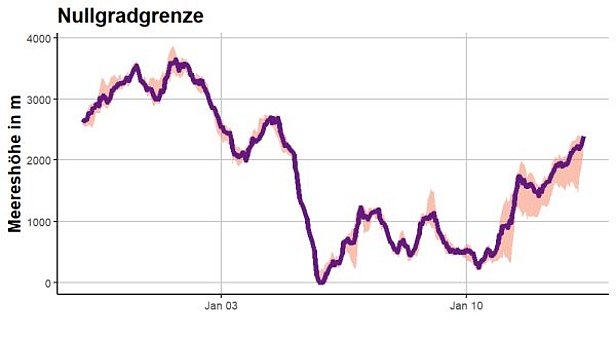 Nach dem sehr milden Jahresende und -anfang, war es in der ersten Hälfte der Berichtsperiode fast schon ungewohnt kalt. Die Nullgradgrenze (Abb. 1) lag grösstenteils unter 1000 m. Doch bereits ab Dienstag, 11. Januar stieg die Temperatur wieder an und die Nullgradgrenze kletterte bis am Donnerstag wieder auf über 2000 m.