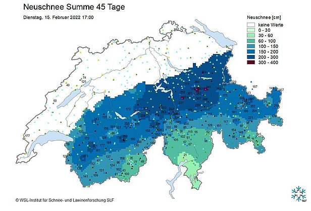 Schwachschichten wie in Abbildung 4 hatten sich im Januar vielerorts gebildet. Ob und wie häufig Lawinen in diesen weichen Schichten noch ausgelöst werden konnten, lag vor allem an der Überdeckung dieser Schichten (Abbildung 6). Am zentralen und östlichen Alpennordhang sowie am nördlichen Alpenkamm waren seit Ende Dezember in Summe verbreitet insgesamt 2.5 bis 3.5 m Neuschnee gefallen. Damit waren die tiefen Schwachschichten dort so mächtig überdeckt, dass es nur noch sehr vereinzelt möglich war, diese als Skifahrer zu stören. Zwei Tourengeher hatten in der Gemeinde Sachseln (OW) am Samstag, 11.02. leider eine solche Gefahrenstelle angetroffen, lösten eine Lawine aus, die vermutlich im Altschnee anbrach, wurden ganz verschüttet und verstarben in der Folge. Dies war seit langem die einzige Lawine dieser Art in diesen Regionen.