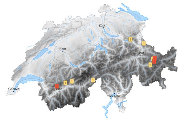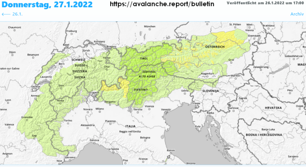 Die allgemein günstige Lawinensituation herrschte am Ende dieser Berichtswoche nicht nur in der Schweiz, sondern auch in fast allen angrenzenden Regionen der Nachbarländer (Abbildung 7). Ein Blick in die Vergangenheit zeigt, dass solch günstige Lawinensituationen im Hochwinter gar nicht so selten sind: in der Schweiz war dies zuletzt in den Wintern 2007/08, 2008/09, und 2010/11 der Fall (vgl. Winterberichte).