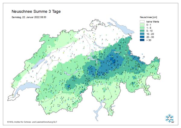 Von Donnerstag, 20. Januar bis Samstag, 22. Januar war es im Norden und Osten bewölkt und es fiel etwas Schnee bis in tiefe Lagen. Mit bis rund 30 cm kam am meisten Schnee in den Glarner Alpen zusammen (Abbildung 2). Der Wind blies in der Höhe stark, zeitweise auch stürmisch aus Nord. Im Jura und an den Voralpen blies eine starke Bise und im Süden starker Nordföhn. Es wurde Neu- und Altschnee verfrachtet (Abbildung 3).