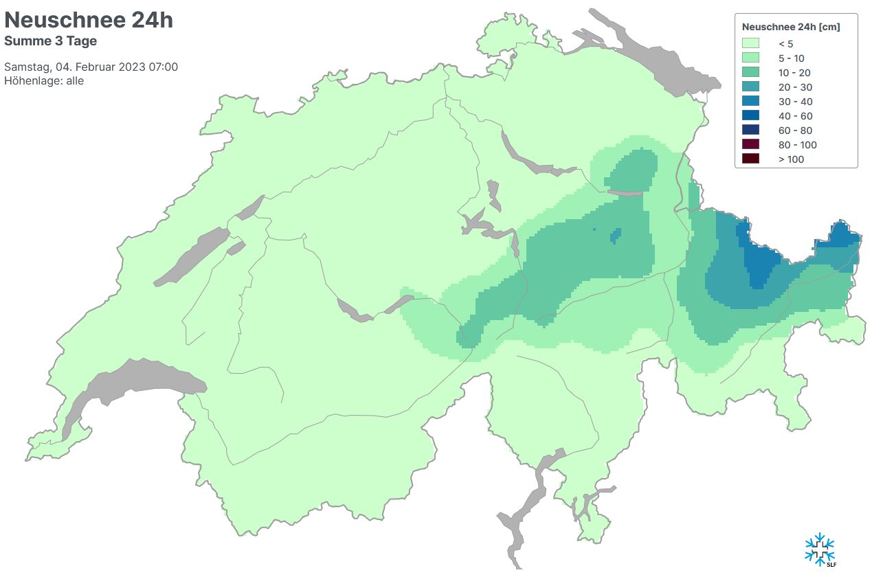 Vom Donnerstag, 2. Februar bis Samstag, 4. Februar fielen vom Prättigau bis ins Samnaun 30 bis 40 cm Schnee, sonst in den daran angrenzenden Gebieten Nordbündens und im Unterengadin 20 bis 30 cm und am Nördlichen Alpenkamm vom Haslital bis ins Alpstein bis 20 cm Schnee (vgl. Abbildung 4).