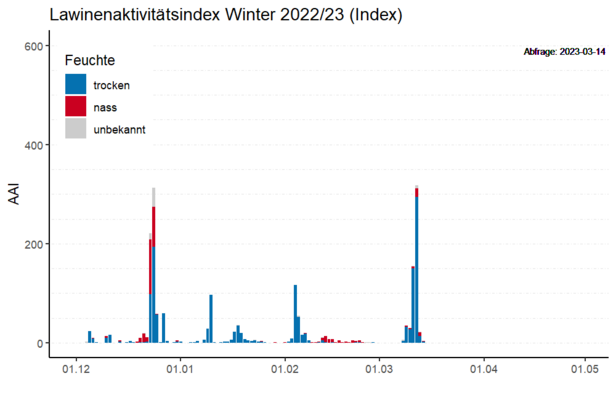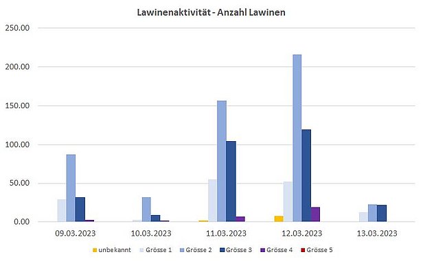 Die Lawinenaktivität erreiche am Sonntag, 12. März den höchsten Wert dieser Periode und egalisierte auch den bis anhin höchsten Wert dieses Winters vom 24. Dezember (vgl. Abbildung 5).