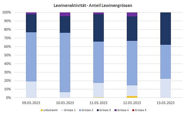 Die gemeldeten Lawinen hatten meist eine Grösse von 2 (mittel) und 3 (gross). Sehr grosse Lawinen (Grösse 4) wurden nur wenige gemeldet, extrem grosse (Grösse 5) gar keine (vgl. Abbildung 6).