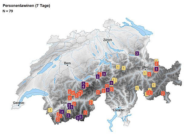 Über die ganze Periode wurden 79 Lawinen gemeldet, die durch Personen ausgelöst wurden (vgl. Abbildung 10). In 18 dieser Lawinen wurden 34 Personen erfasst. In drei dieser Lawinen wurden insgesamt sechs Personen erfasst und vier davon ganz verschüttet. Leider verstarben alle diese vier Personen.