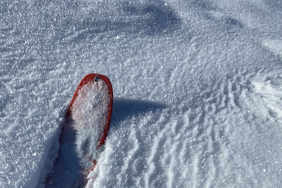 Im Westen hatte es seit dem 20. Januar, im Osten seit einem Monat nicht mehr ordentlich geschneit. Zudem war es seit den letzten Niederschlägen schon im Februar frühlingshaft mild mit einer Nullgradgrenze, die wiederholt um 3000 m lag. Damit entwickelte sich eine ausgesprochene Schneearmut. Diese trockene Periode war begleitet von vielen sonnigen Tagen und klaren Nächten. Damit wandelten sich die oberflächennahen Schneeschichten oder auch die ganze, dünne Schneedecke erneut um. Resultat waren lockere, kantig aufgebaute oberflächennahe Schichten, vor allem an Nordhängen (West über Nord bis Ost). Anfangs März hatte sich zudem in allen Gebieten verbreitet grosser Oberflächenreif gebildet (vgl. Abbildung 1).