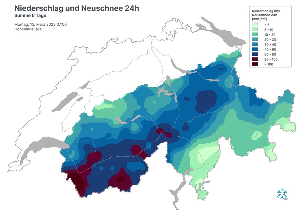 Erste Niederschläge setzten am Dienstagnachmittag, 7. März im Westen und Süden ein. Nach einer Pause in der Nacht auf Mittwoch folgten im Tagesverlauf weitere Niederschläge. Die Schneefallgrenze stieg rasch von rund 1200 auf 1700 m bis 2000 m (vgl. Abbildung 2). Am Donnerstag, 9. März war es tagsüber meist sonnig, bevor in der Nacht zum Freitag erneut Niederschläge einsetzten, die am Alpennordhang bis in die Nacht zum Montag, 13. März anhielten. Die Schneefallgrenze sank am Samstag, 11. März von rund 1500 m vorübergehend bis in tiefe Lagen, im Wallis und am Alpensüdhang blieb sie höher. Tagsüber war es am Montag dann mit hohen Wolken teils sonnig. Auf Dienstag, 14. März setzten dann neue Niederschläge ein.
