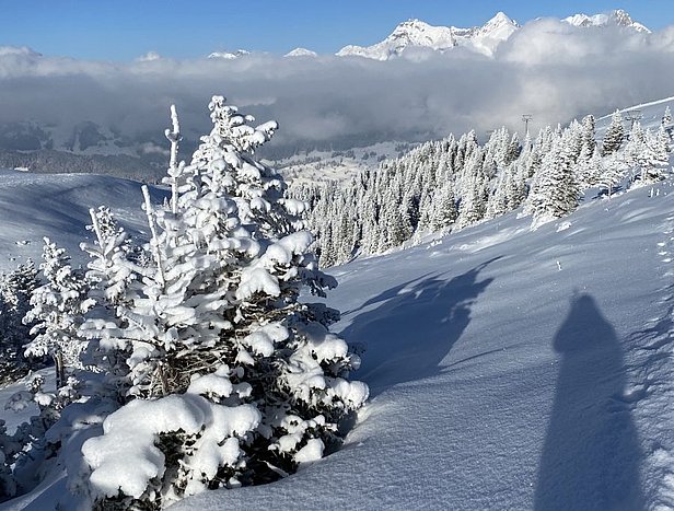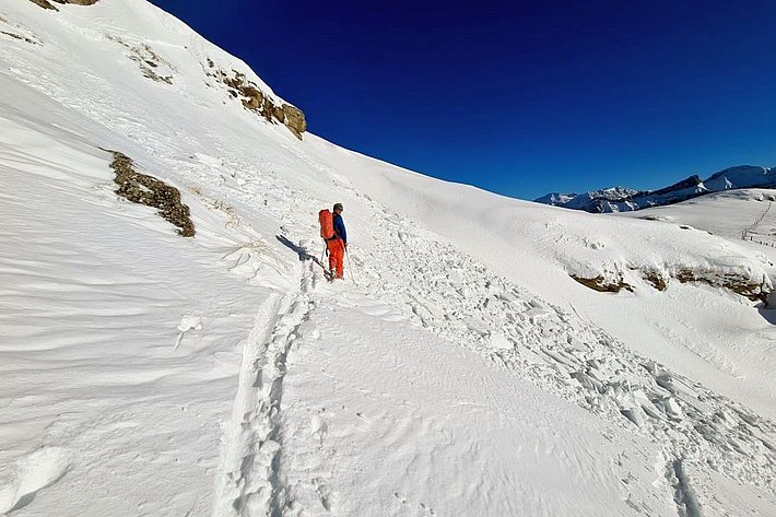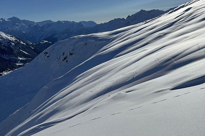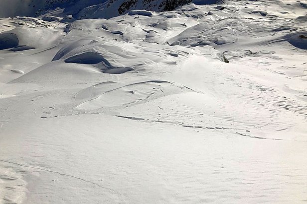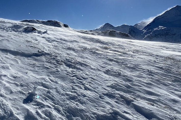 Am Alpenhauptkamm und im Süden kam am Samstag Nordwind auf, der bis am Abend stark wurde und auch in die Täler hinunter griff. Dabei wurde nicht nur der wenige Neuschnee vom Freitag, sondern auch lockerer Schnee der vergangenen Niederschlagsperiode verfrachtet (Abbildung 6). Am Sonntag gab es im Norden zunehmend Aufhellungen, im Westen und Süden war es sonnig.
