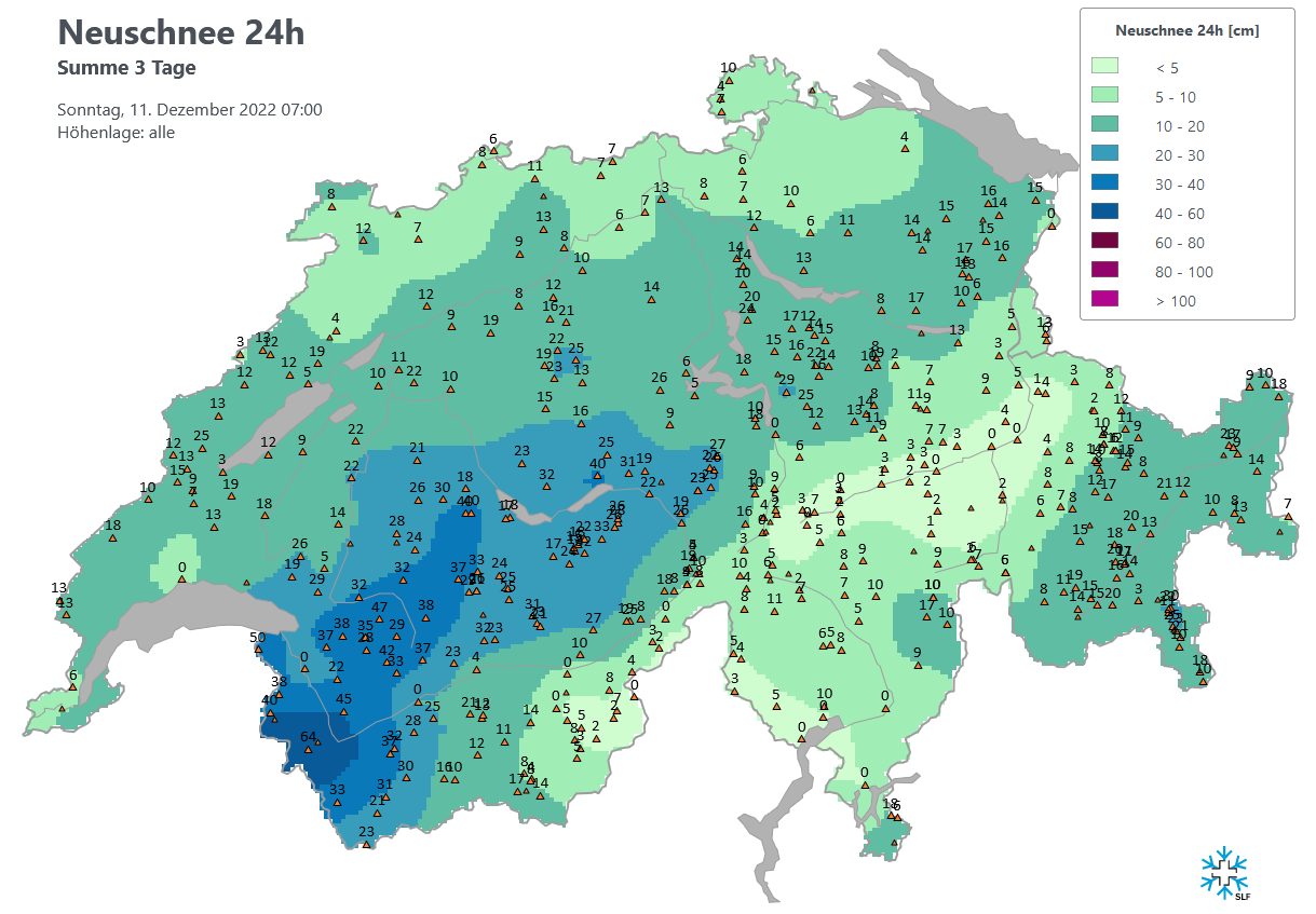 Mit meist mässigem Südwestwind schneite es am Freitag, 9. Dezember im Westen intensiv. Im Osten stellte sich eine leichte Föhnlage ein: Während vom Sottoceneri bis zur Bernina etwa 20 cm Schnee fielen, war es im Nordosten zwar bedeckt, aber weitgehend trocken. Im Laufe des Samstags, 10. Dezember wehte der Wind nur noch schwach, so dass im Norden lockerer Pulverschnee fiel (Abbildung 1).