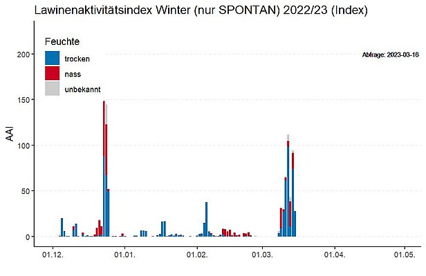 Es gab am Mittwoch zwar weniger spontane Lawinen, mit Zusatzlast waren diese aber noch immer leicht auslösbar. Dies veranschaulichen die guten Sprengerfolge zur Sicherung von Skigebieten und Infrastruktur (Abbildung 9) und die Lawinenauslösungen durch Personen (Abbildung 10). Lawinen brachen meist in den ausgeprägten Schwachschichten, die ab Dienstag, 07.03. eingeschneit worden waren. Teilweise wurde aber auch die gesamte Schneedecke mitgerissen.