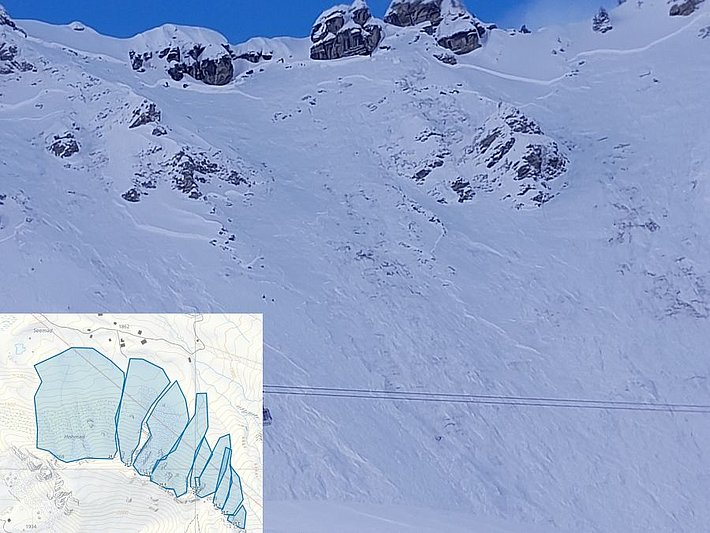 Auch am Alpennordhang gingen während und gegen Ende des Niederschlags viele spontane Lawinen ab. Einige wurden trotz der geringen Gesamtschneehöhen diesen Winter gross bis sehr gross (vgl. Abbildung 6 und 7).