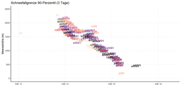 Die Schneefallgrenze lag zu Beginn des Niederschlags auf rund 2000 m, sank zögerlich auf etwa 1500 m ab und lag am Ende des Schneefalls in tiefen Lagen (vgl. Abbildung 2).