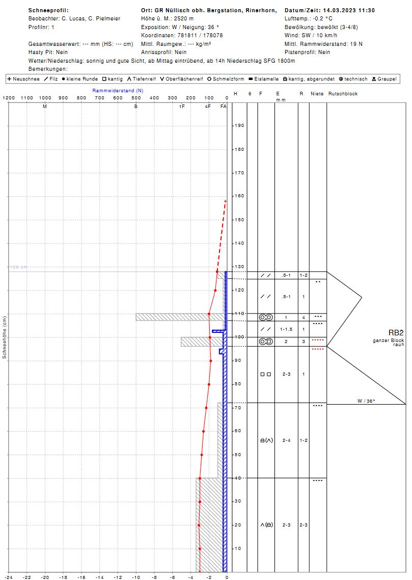 Vor allem während der ersten, sehr intensiven Niederschlagsphase in der Nacht auf Dienstag gingen viele spontane Lawinen ab. Zum einen wurden in dieser Phase viele spontane Lawinen in den Hauptniederschlagsgebieten des Westens beobachtet, zum anderen aber auch in Mittel- und Südbünden. Dort fiel der warme Neuschnee begleitet von starkem Südwind vor allem an den West-, Nord- und Osthängen oberhalb von rund 2200 m auf eine ausgesprochen ungünstige Altschneedecke. Die ausgeprägten Schwachschichten waren von der letzten Niederschlagsperiode erst geringmächtig überdeckt worden und noch sehr störanfällig. Zudem war in diesen Regionen verbreitet die ganze Altschneedecke kantig aufgebaut und schwach (vgl. Abbildung 3, weitere Infos zum Lesen von Profilgrafiken finden sich hier).
