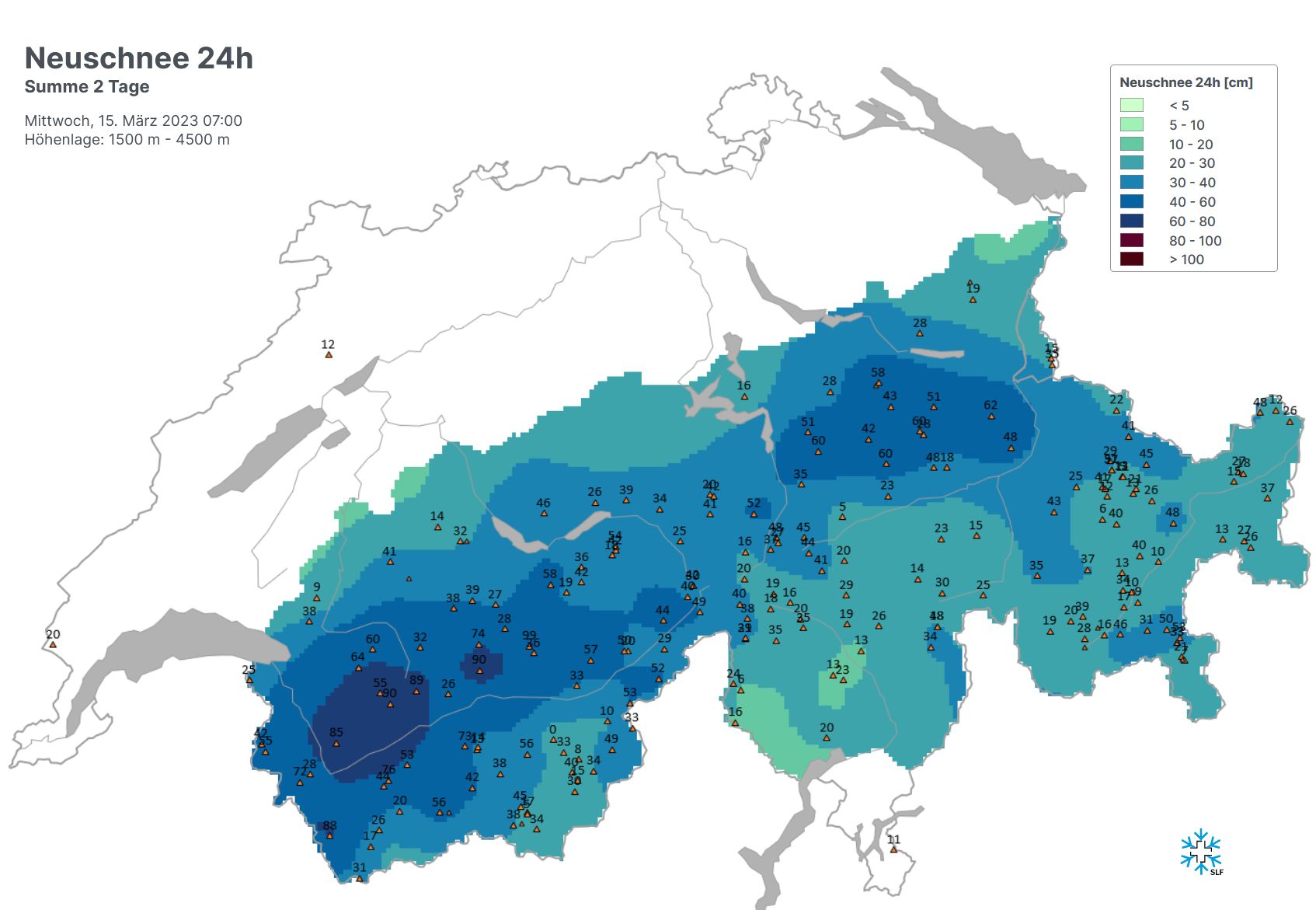 In der Nacht auf Dienstag zog aus Westen und Süden intensiver Niederschlag über die Alpen. Die Hauptniederschlagsgebiete während der Nacht waren ganz im Westen und am Alpenhauptkamm vom Rheinwald bis zur Bernina und in Mittelbünden. Nach einer kurzen Niederschlagspause fiel im Norden, im Wallis und in Graubünden nochmals Schnee bis am Mittwochmorgen. Im ganzen Ereignis fielen im Westen in der Höhe bis 90 cm Schnee (vgl. Abbildung 1).
