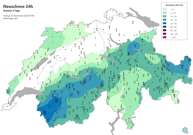 Schon über den ganzen November hinweg fiel immer wieder etwas Schnee. Auch in dieser Woche setzte sich das allmähliche Einschneien im Westen und Norden der Schweizer Alpen fort. Von Montagmorgen, 21.11. bis Freitagmorgen, 25.11. fiel im Westen 30 bis 60 cm, sonst verbreitet 20 bis 30 cm Schnee (Abbildung 1). Im Jura und in den Voralpen sowie im Süden und in den alpenkammnahen Gebieten Mittelbündens fiel weniger Schnee. Die Schneefallgrenze lag zwischen 800 und 1500 m, sodass es auch in den mittleren Lagen und auf den Jurahöhen weiss wurde (vgl. Bildstrecke). Starker Wind aus westlichen Richtungen verfrachtete den Neuschnee in der Höhe zeitweise intensiv.