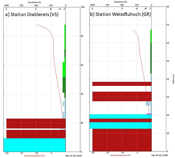 Basierend auf dem Durchschnitt der letzten 20 Jahre waren die Schneehöhen am 25. November 2022 in der Zentralschweiz und in den östlichen sowie südlichen Alpen klar unterdurchschnittlich, in den Berner- und Walliser-Alpen dagegen verbreitet durchschnittlich, in den Walliser-Alpen unter 2000 m teilweise sogar leicht überdurchschnittlich (Abbildung 4).