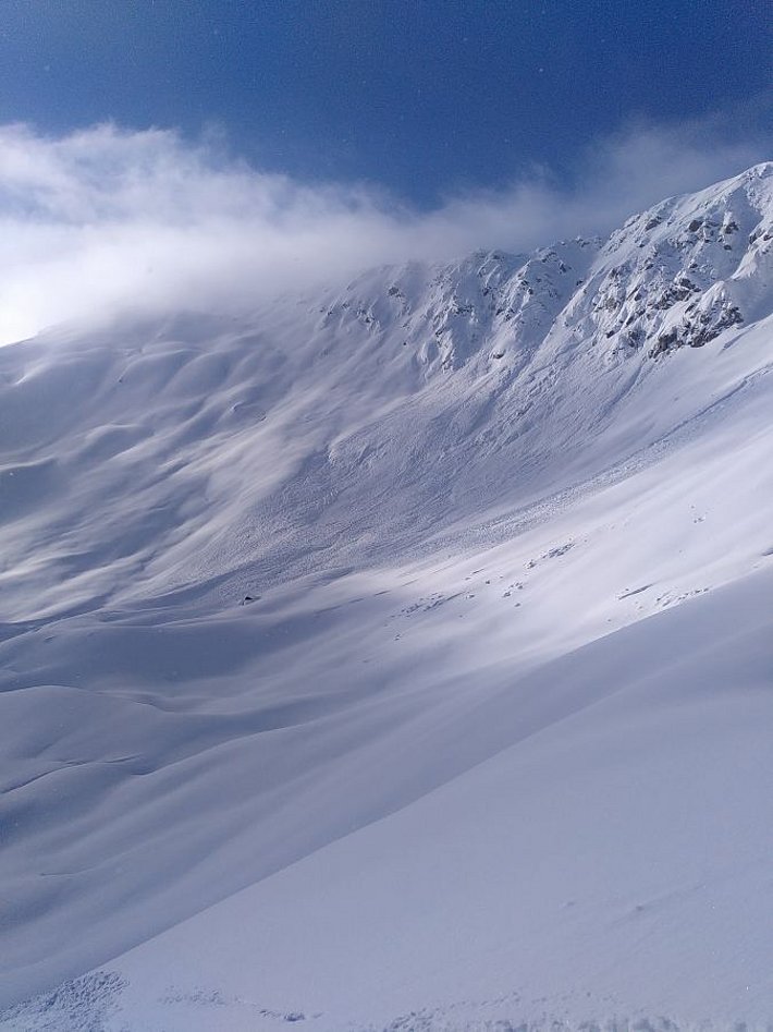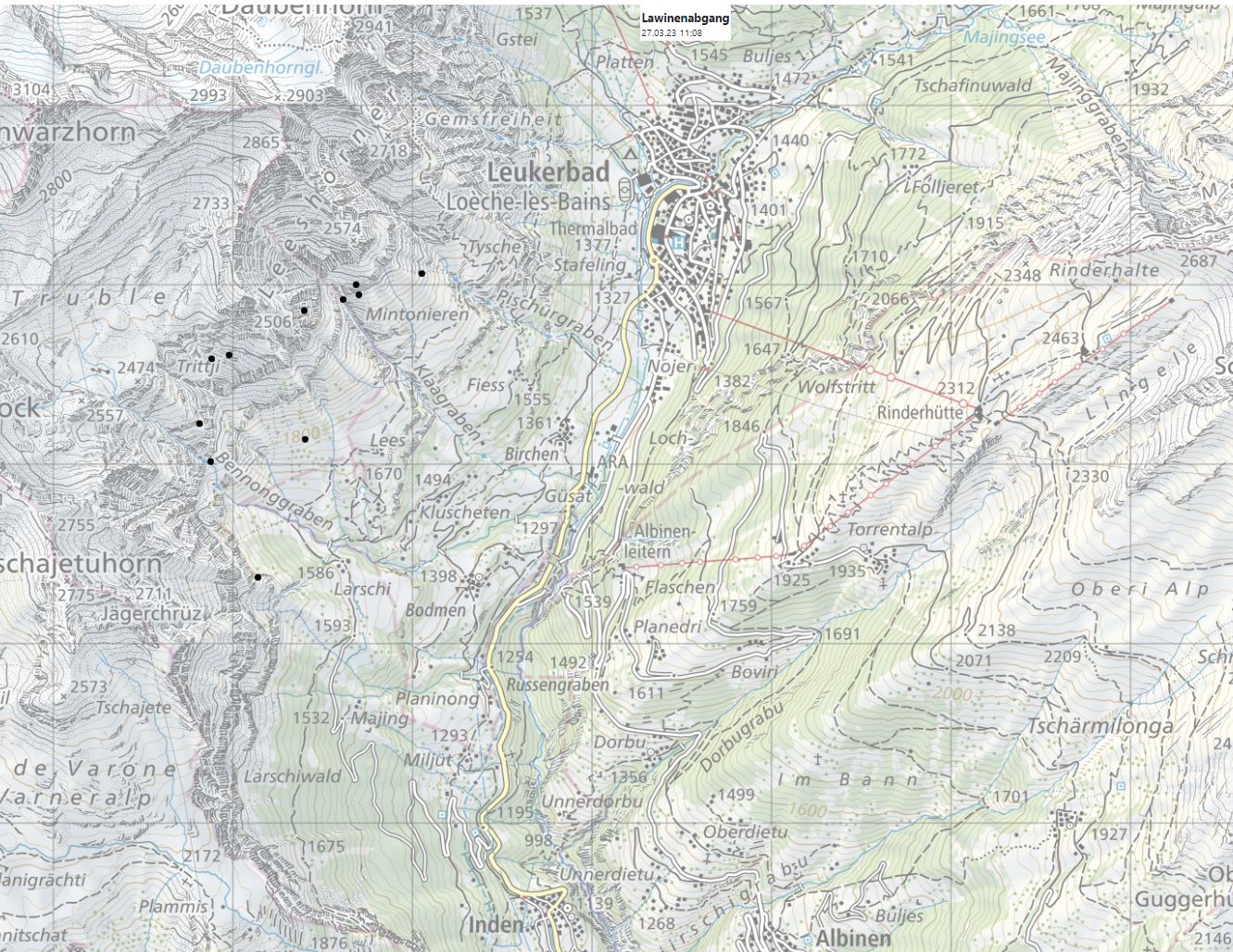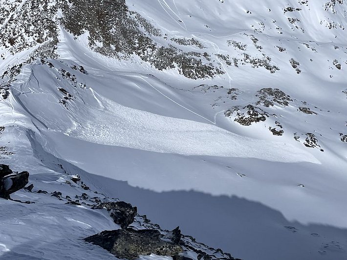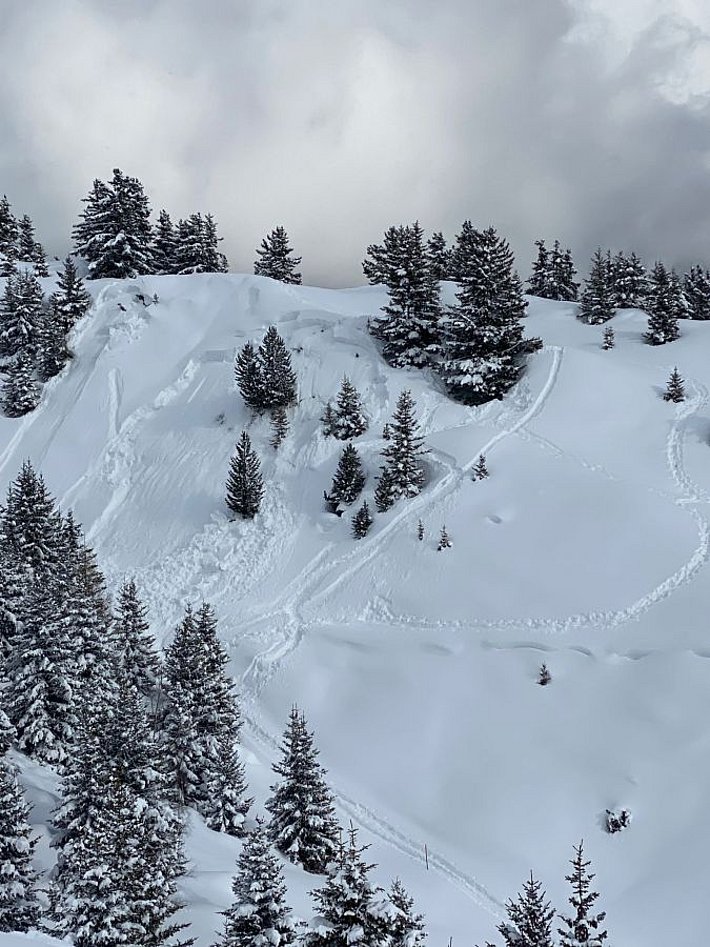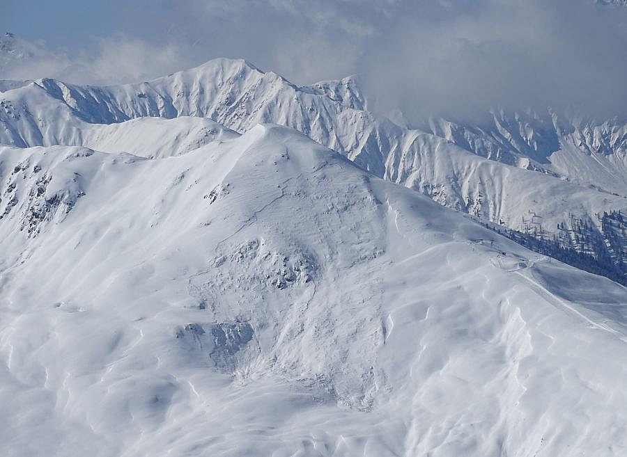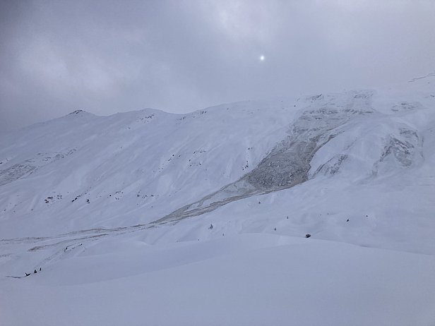 Zudem wurden während und nach dem Schneefall viele Lawinen zur Sicherung von Skipisten und Infrastruktur künstlich ausgelöst. Dabei wurde mindestens eine sehr gross und riss den nassen Altschnee mit (vgl. Abbildung 5).