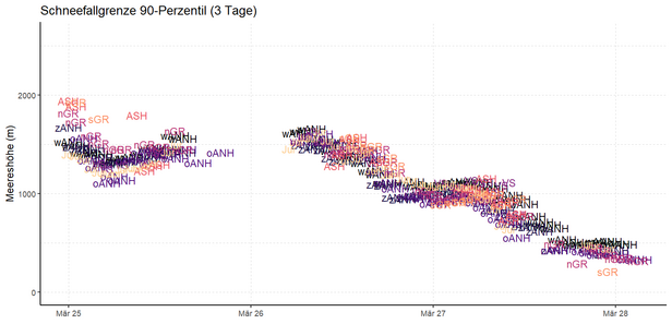 Ab Sonntagmorgen, 26.3. setzte aus Westen intensiver Schneefall ein. Mit der Drehung des Windes auf Nordwest verlagerten sich die intensiven Schneefälle auf die Staugebiete am nördlichen Alpenkamm und auf Nordbünden. Während des Ereignisses blies meist starker West- bis Nordwind und die Schneefallgrenze sank von rund 1500 m allmählich in tiefe Lagen (vgl. Abbildung 1).
