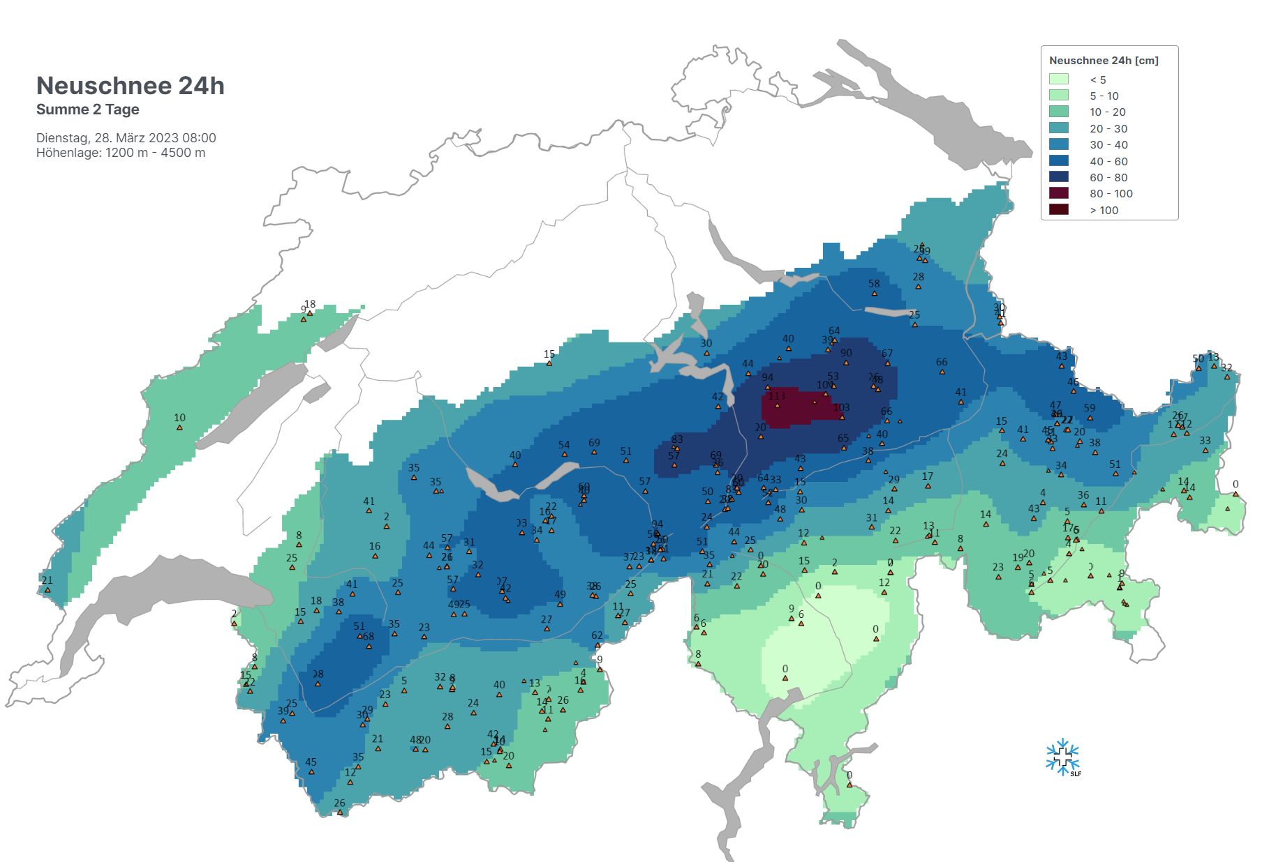 Innerhalb von zwei Tagen fielen vor allem in den Staugebieten am Alpennordhang beachtliche Schneemengen (vgl. Abbildung 2). In diesen Gebieten war es einer der grössten Schneefälle dieses Winters.