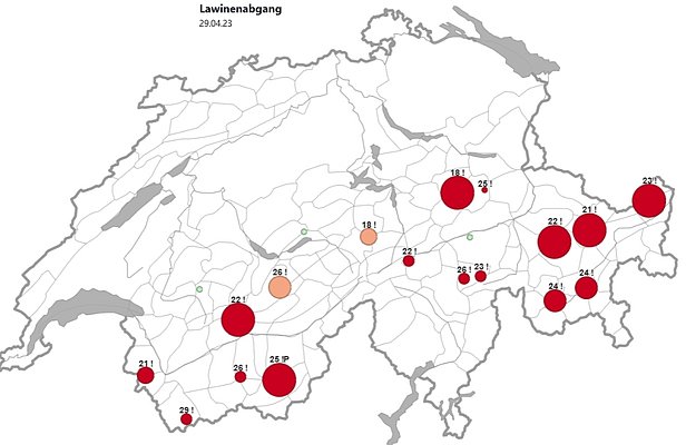 Die Gefahr von nassen Lawinen stieg deutlich an und war, aufgrund des Regens, der Wärme und der fehlenden nächtlichen Abstrahlung die Hauptgefahr. Mit Regen und der Sonneneinstrahlung lösten sich am 27. und 28. April einzelne, vor allem aber am Samstag, 29. April zahlreiche grosse Nass- und Gleitschneelawinen und teils auch sehr grosse Nassschneelawinen (Abbildungen 4 und 5). Die Lawinen rissen häufig flächig an. Wegen der geringen Schneehöhen waren aber die Ablagerungen im Verhältnis zu den Anrissbreiten relativ klein. Am Sonntag, 30. April nahm die Lawinenaktivität ab.