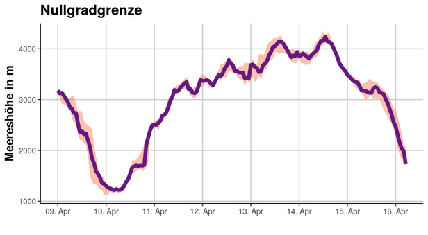 Anschliessend an den Ostersturm war es, während ein paar Tagen aussergewöhnlich mild, mit einer Nullgradgrenze, die sich zwischen 3500 bis 4000 m bewegte. Während dieser Periode wurde die Schneedecke an Ost-, Süd-, und Westhängen bis ins Hochgebirge durchfeuchtet.