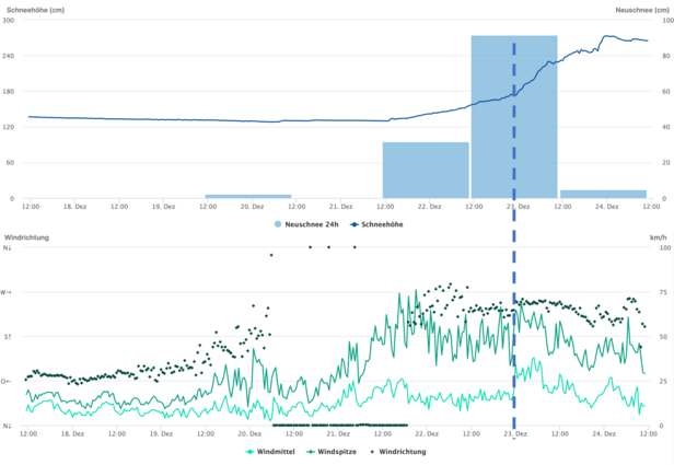 Nach ein paar sonnigen Tagen vor der Berichtsperiode, kündigten die Wettermodelle sehr grosse Neuschneemengen und Sturm für Donnerstag, 21.12. bis Samstag, 23.12. an. Angesichts der aussergewöhnlichen Neuschneemengen und den in den Bergen für die Jahreszeit überdurchschnittlichen Schneehöhen (Abbildung 1), wurde im Lawinenwarnraum sogar kurz diskutiert, ob man, sollte der Neuschnee wirklich im prognostizierten Mass kommen, eventuell sogar eine Lawinengefahrenstufe 5 (sehr gross) ausgeben müsste.