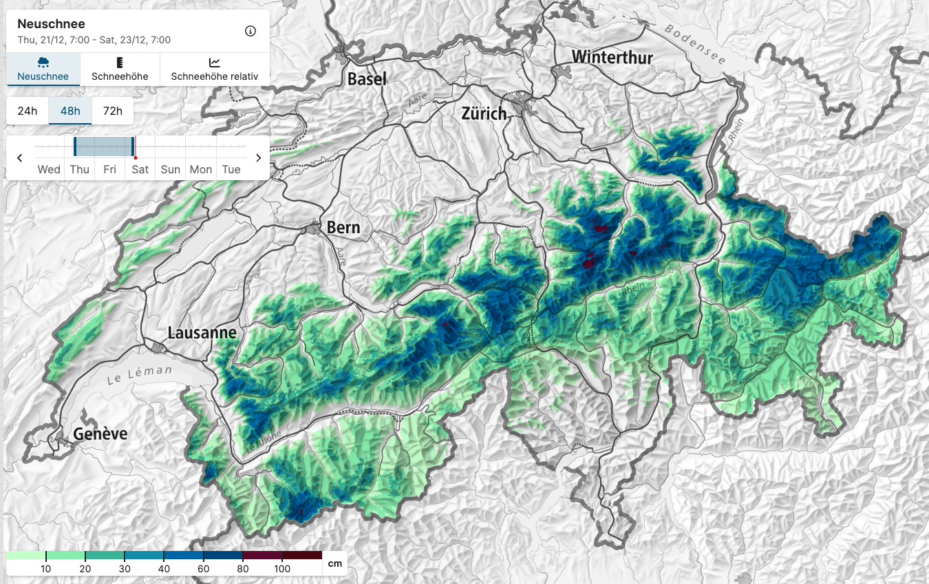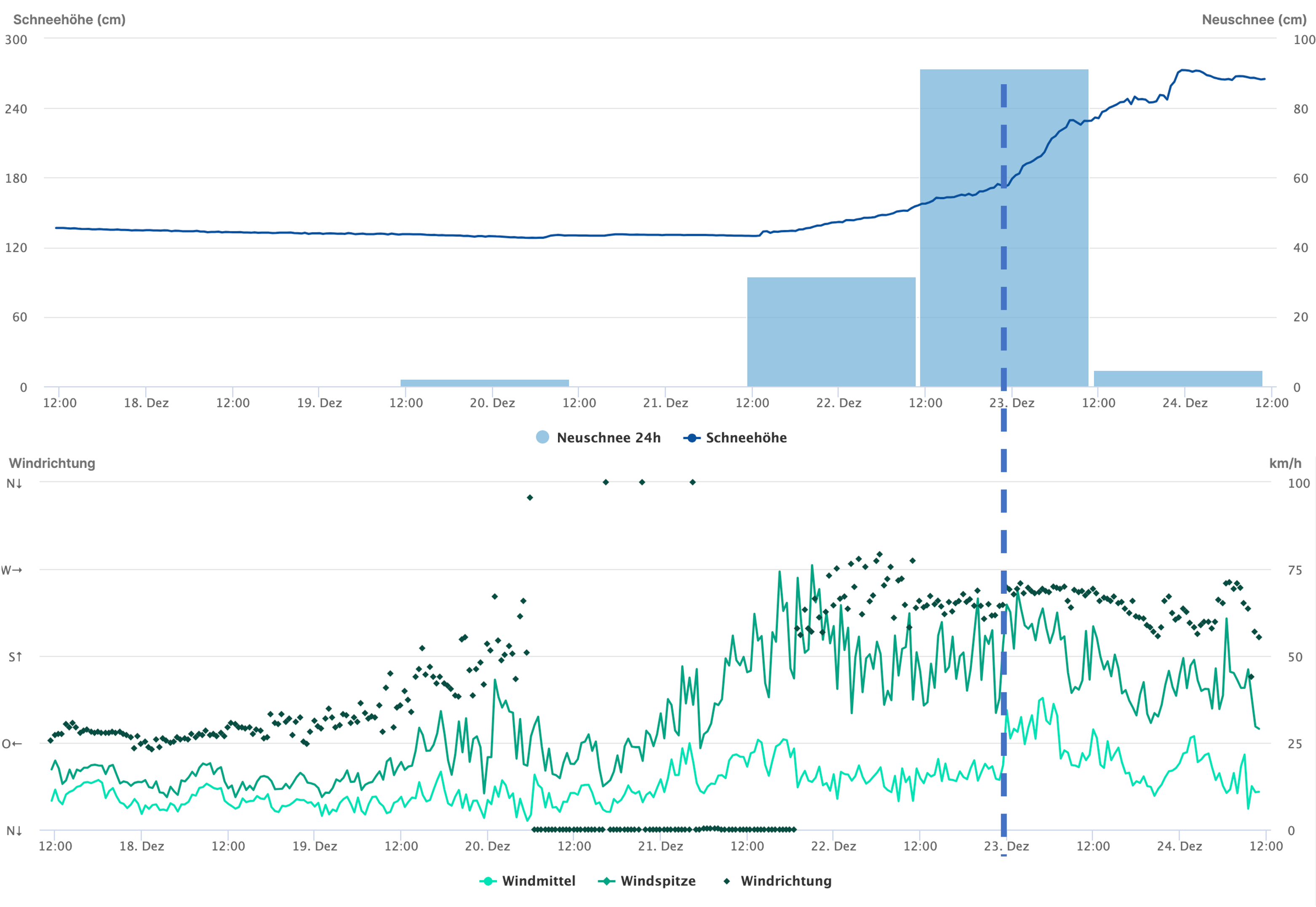Nach ein paar sonnigen Tagen vor der Berichtsperiode, kündigten die Wettermodelle sehr grosse Neuschneemengen und Sturm für Donnerstag, 21.12. bis Samstag, 23.12. an. Angesichts der aussergewöhnlichen Neuschneemengen und den in den Bergen für die Jahreszeit überdurchschnittlichen Schneehöhen (Abbildung 1), wurde im Lawinenwarnraum sogar kurz diskutiert, ob man, sollte der Neuschnee wirklich im prognostizierten Mass kommen, eventuell sogar eine Lawinengefahrenstufe 5 (sehr gross) ausgeben müsste.