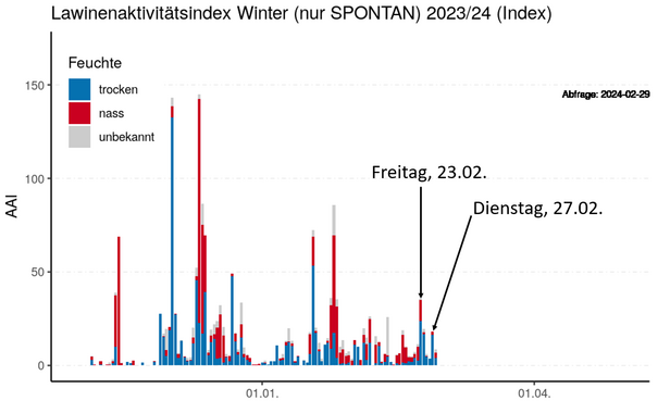 Am Freitag, 23. Februar wurde für einige südliche Regionen aufgrund der beträchtlichen Neuschneemengen mit grosser Lawinengefahr (Stufe 4) gewarnt (siehe Gefahrenstufenverlauf am Seitenende). Aufgrund der Intensität des Schneefalls und der registrierten spontanen Lawinenaktivität lässt sich diese Stufe weitgehend bestätigen (Abbildung 8). Diese Einschätzung spiegelt sich auch in den Rückmeldungen der SLF-Beobachter der betreffenden Regionen wider.