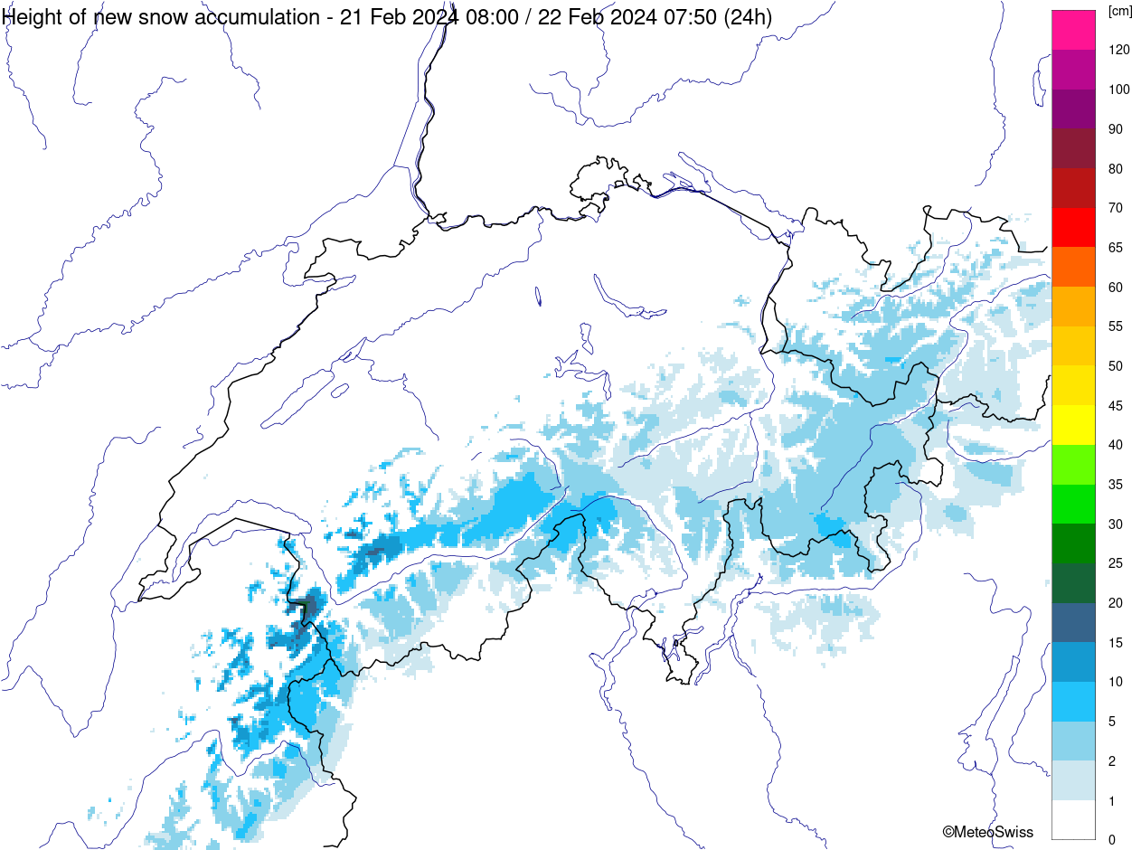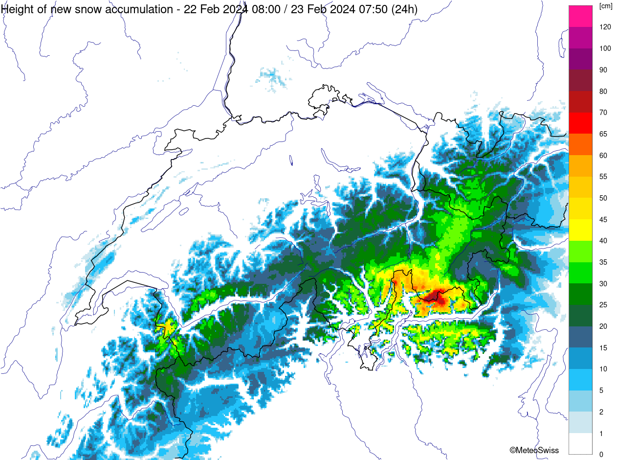 Am Donnerstag, 22. Februar erreichte eine Kaltfront die Schweiz (MeteoSchweiz-Blog). Diese brachte zunächst im Westen viel Niederschlag: Im westlichsten Unterwallis fielen bis am Donnerstagabend bis zu 40 cm (Abbildung 4a). Die Schneefallgrenze sank von rund 1800 m bis in tiefe Lagen (Abbildung 3).