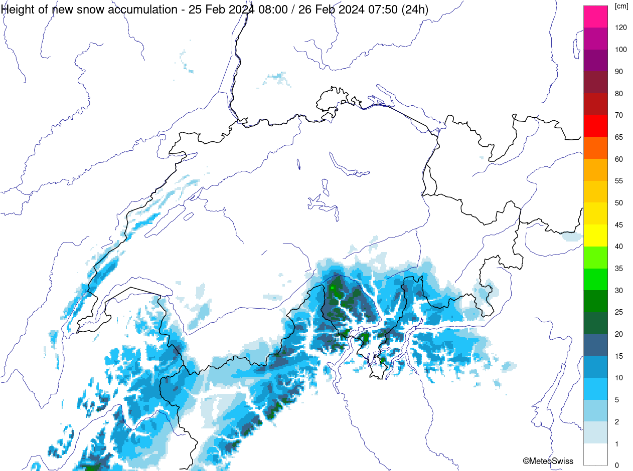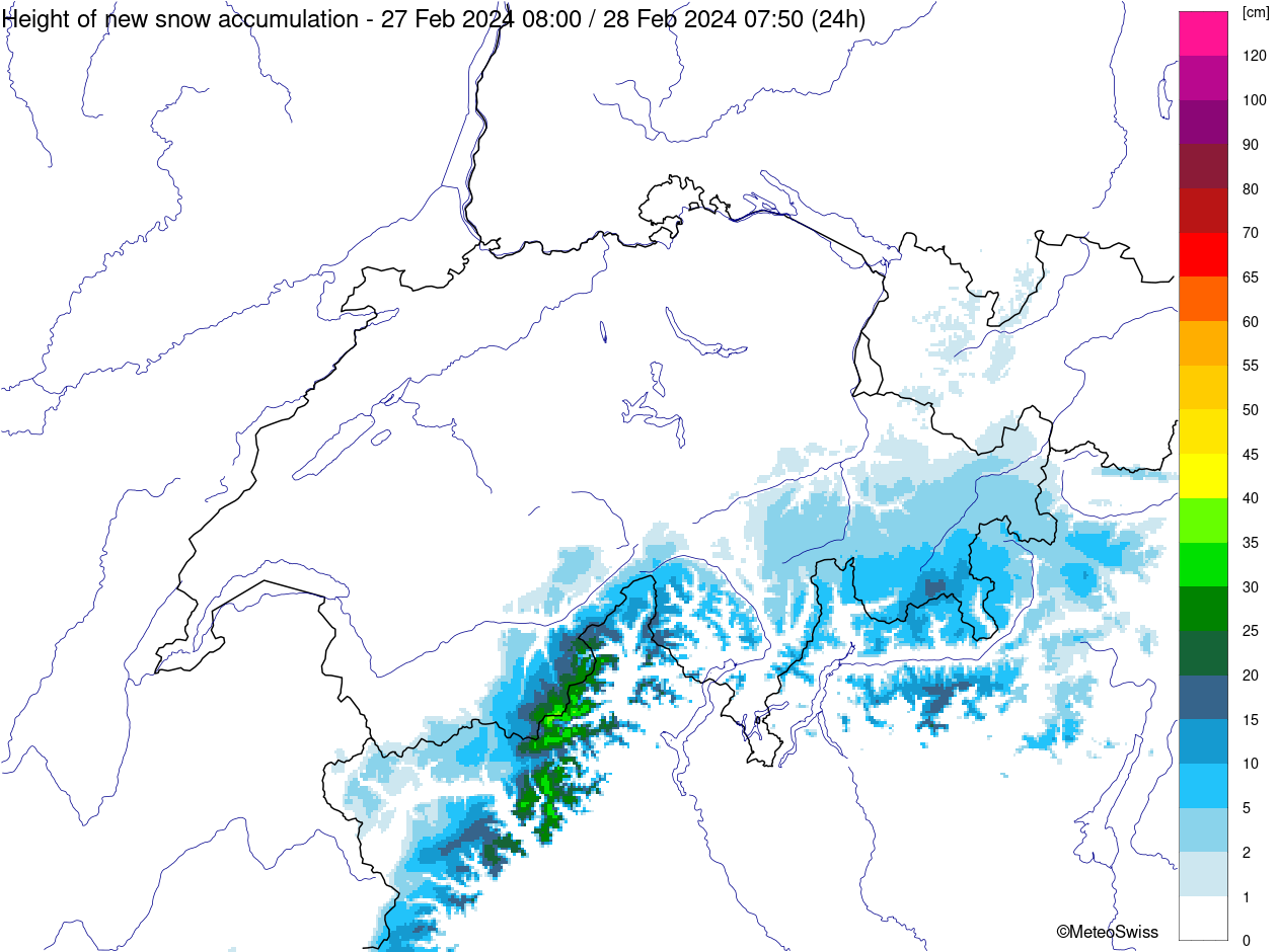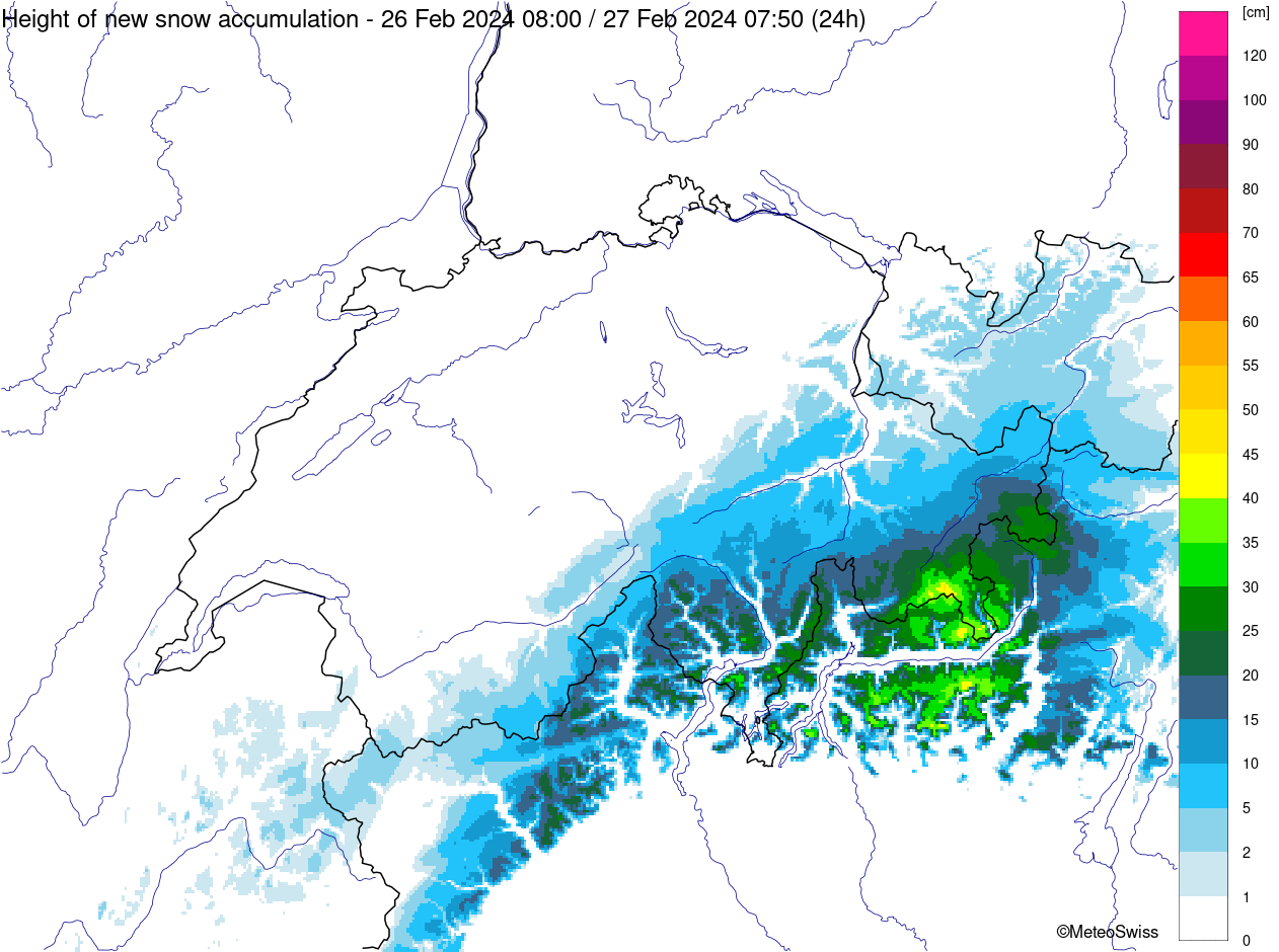 Der Schneefall war jedoch noch nicht vorbei. Es stellte sich eine ausgeprägte Südstaulage ein (Abbildung 6). Bis zum Ende der Niederschlagsperiode am Mittwochmorgen, 28. Februar wurden im Süden täglich weitere 10 bis 30 cm gemessen. Der Niederschlagsschwerpunkt lag dabei zeitweise etwas weiter östlich im Berninagebiet oder auch etwas weiter westlich am Oberwalliser Alpenhauptkamm (Abbildung 4).